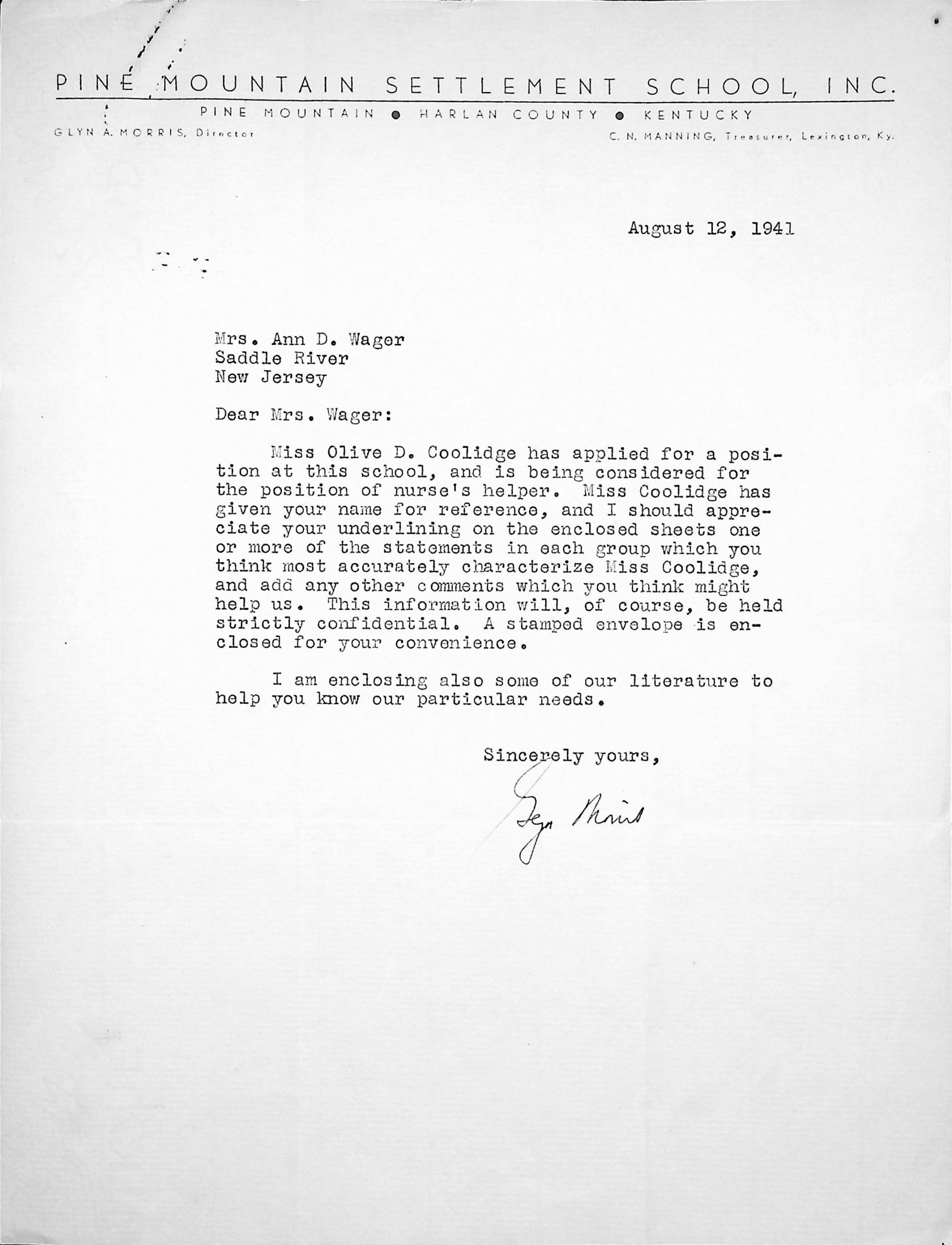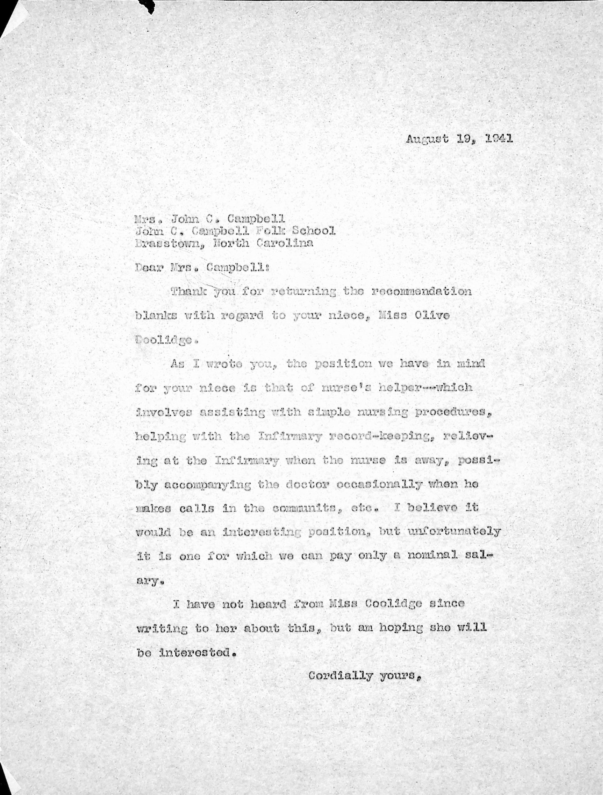 167 [image00167.jpg] To Mrs. John C. Campbell at the John C. Campbell Folk School in Brasstown, NC, August 19, 1941, from [unsigned, likely Glyn Morris]. The letter thanks Mrs. Campbell for returning the recommendation form and explains the position for which her niece (Olive Coolidge) is applying: