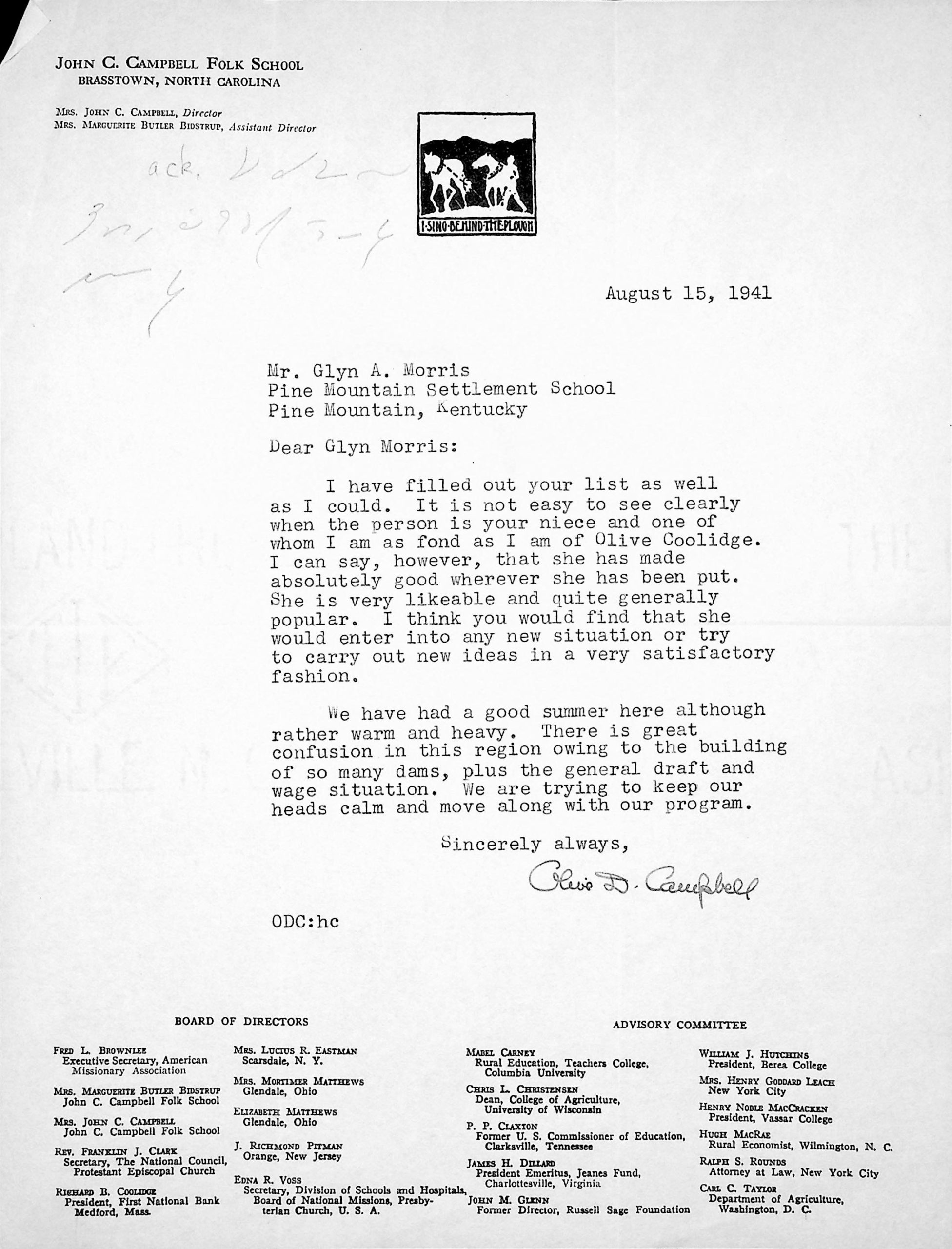 To Mrs. John C. Campbell in Brasstown, NC, [unsigned] likely from Glyn Morris, August 19, 1941.
