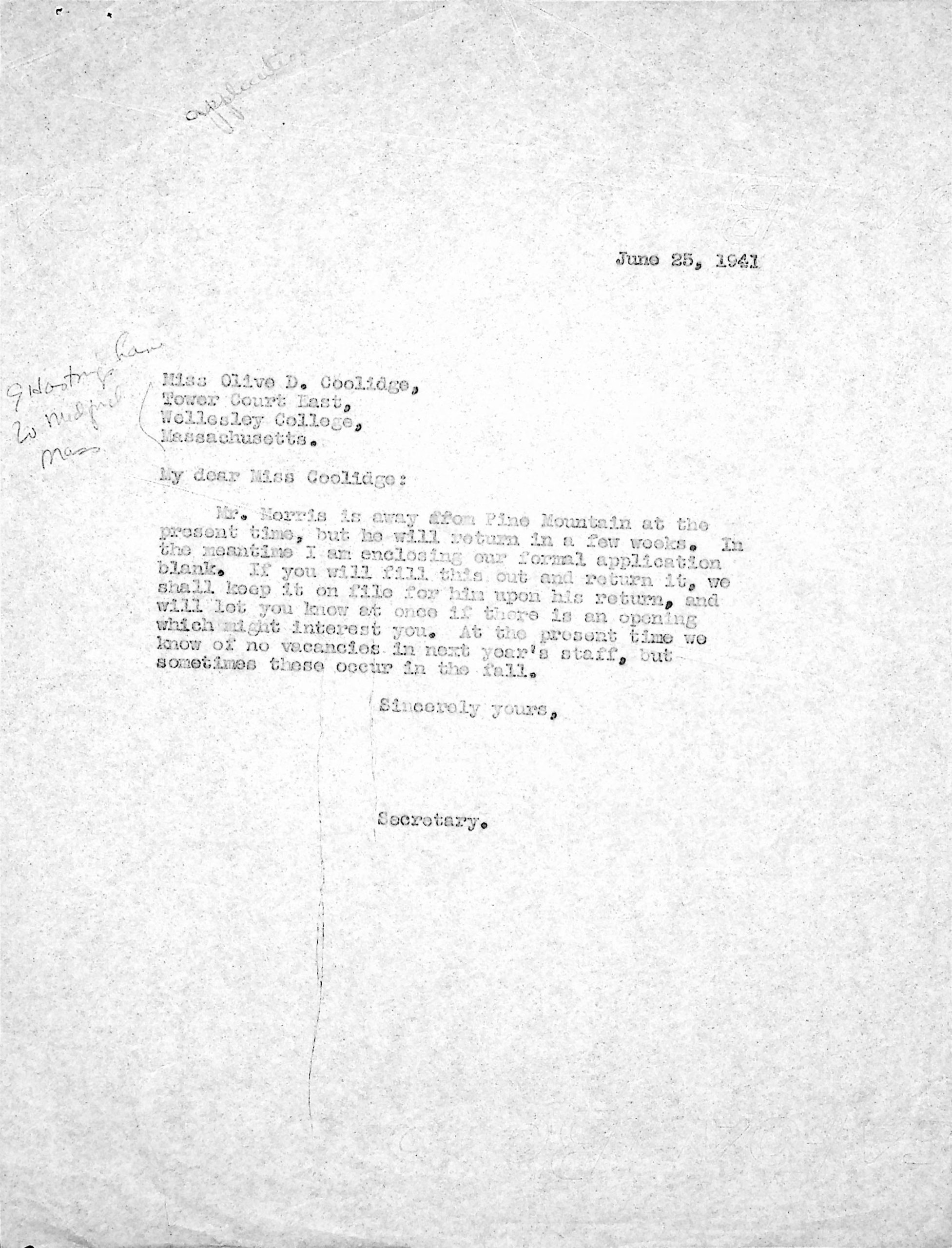 160 [image00160.jpg] Carbon copy of typewritten letter to Miss Coolidge from [unsigned], responding for Glyn Morris, June 25, 1941. Encloses application blank.