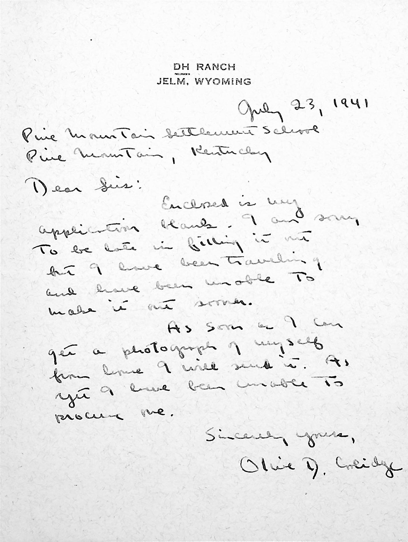 161 [image00161.jpg] To “Sirs” from Olive D. Coolidge at DH Ranch, Jelm, Wyoming, July 23, 1941. Returns completed application blank.