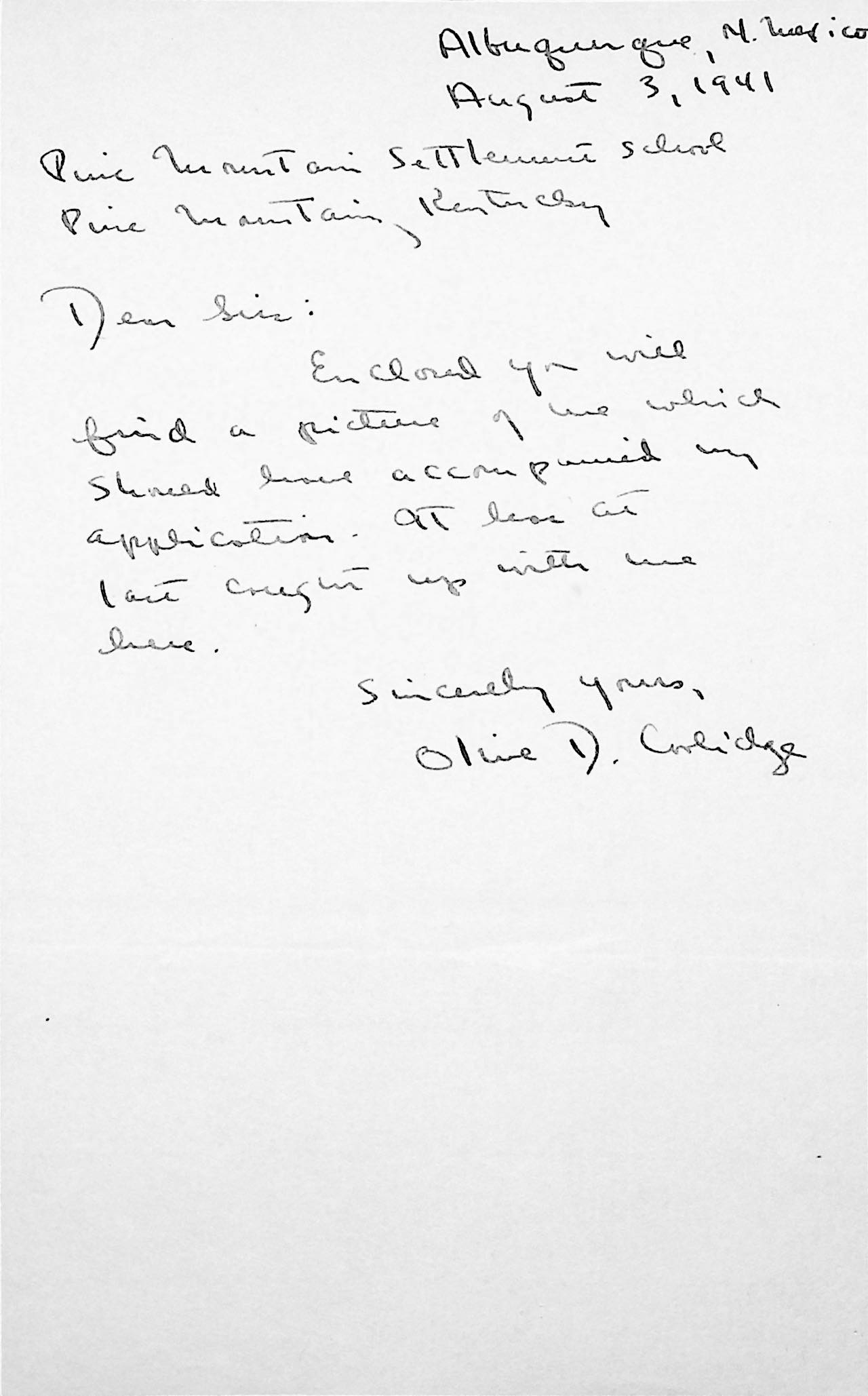 163 [image00163.jpg] To “Sirs” from Coolidge in Albuquerque, NM, August 3, 1941. Encloses her photograph.