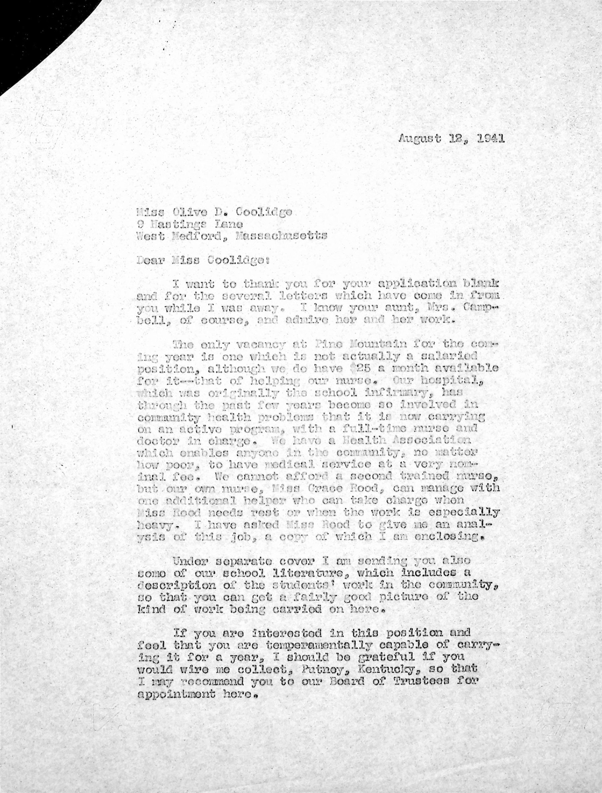 Miss Olive Coolidge is engaged by the Pine Mountain Settlement School, Inc. for the school year 1941-42 as assistant to the school nurse. Her salary is $25.00 per month plus maintenance and laundry. She is entitled to two weeks’ vacation with pay during the Christmas holidays.