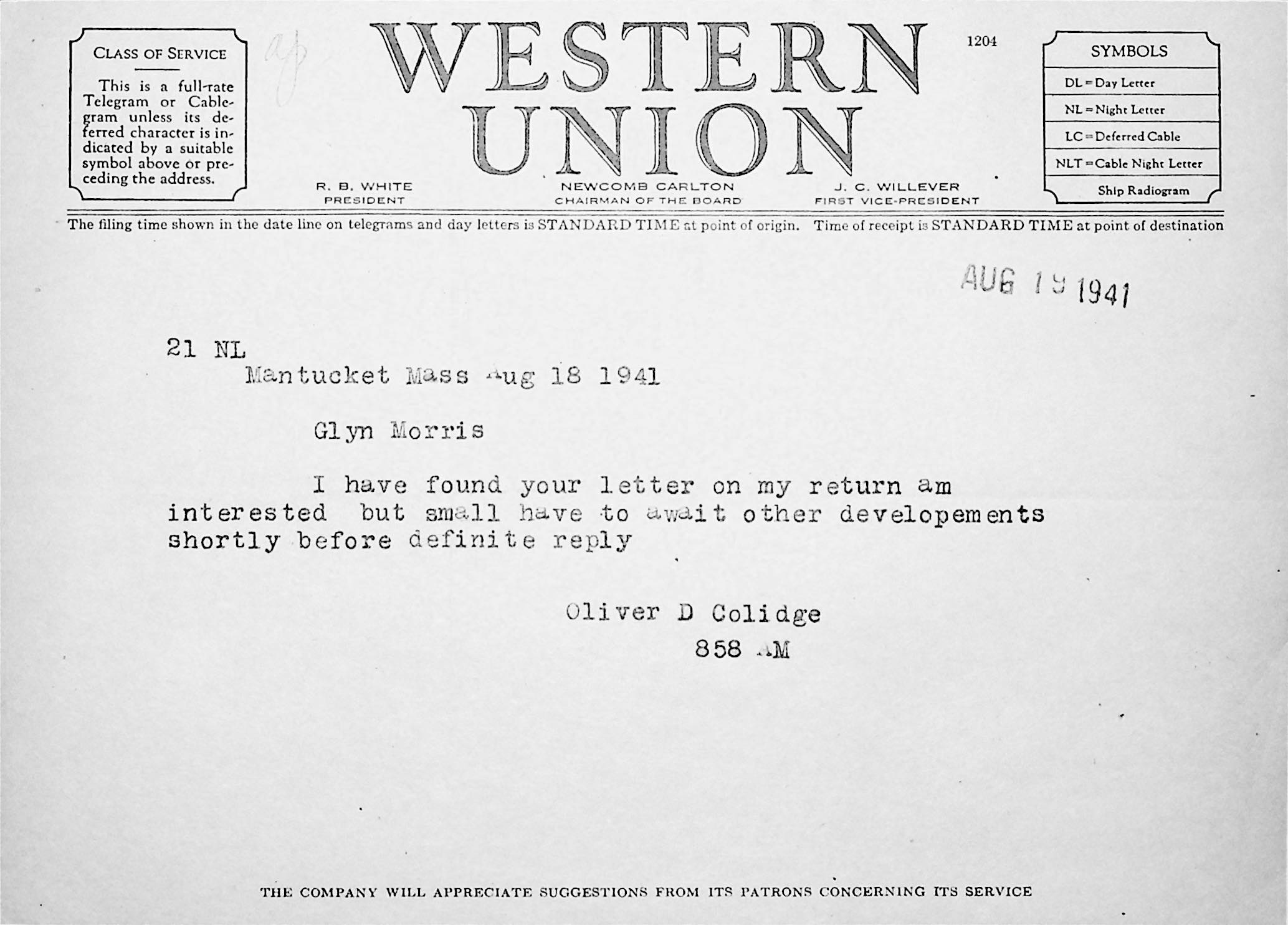 166 [image00166.jpg] Typewritten Western Union telegram to Morris from Coolidge in Nantucket, MA, August 18, 1941. Coolidge is interested in the position but has to “await other developments shortly before definite reply.”