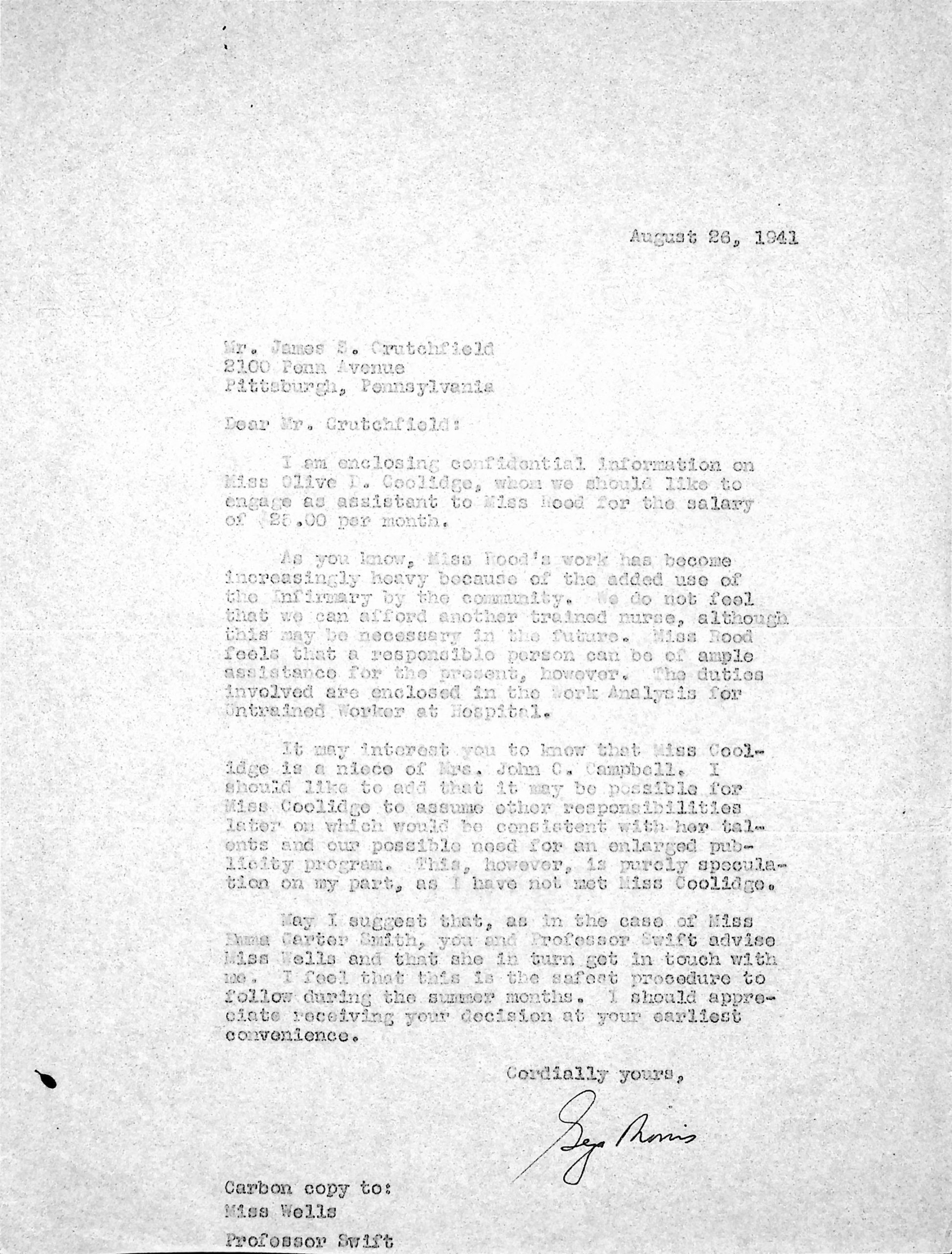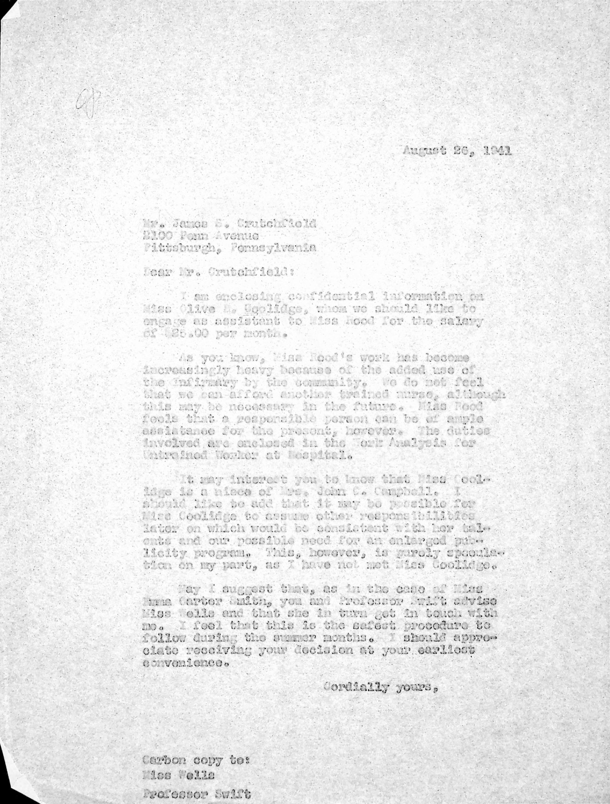 169 [image00169.jpg] To Mr. James S. Crutchfield in Pittsburgh, PA, [unsigned], likely Morris, August 26, 1941. Carbon copies to Miss [Evelyn K.] Wells and Professor Swift. Encloses “confidential information on Miss Olive D. Coolidge, whom we should like to engage as an assistant to Miss Rood for the salary of $25.00 per month.” The letter suggests that Crutchfield and Swift advise Miss Wells and that she inform Morris. The letter also describes the need for an assistant: