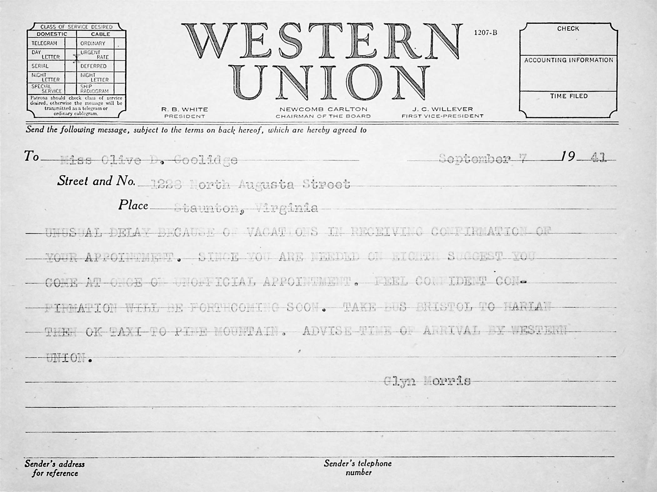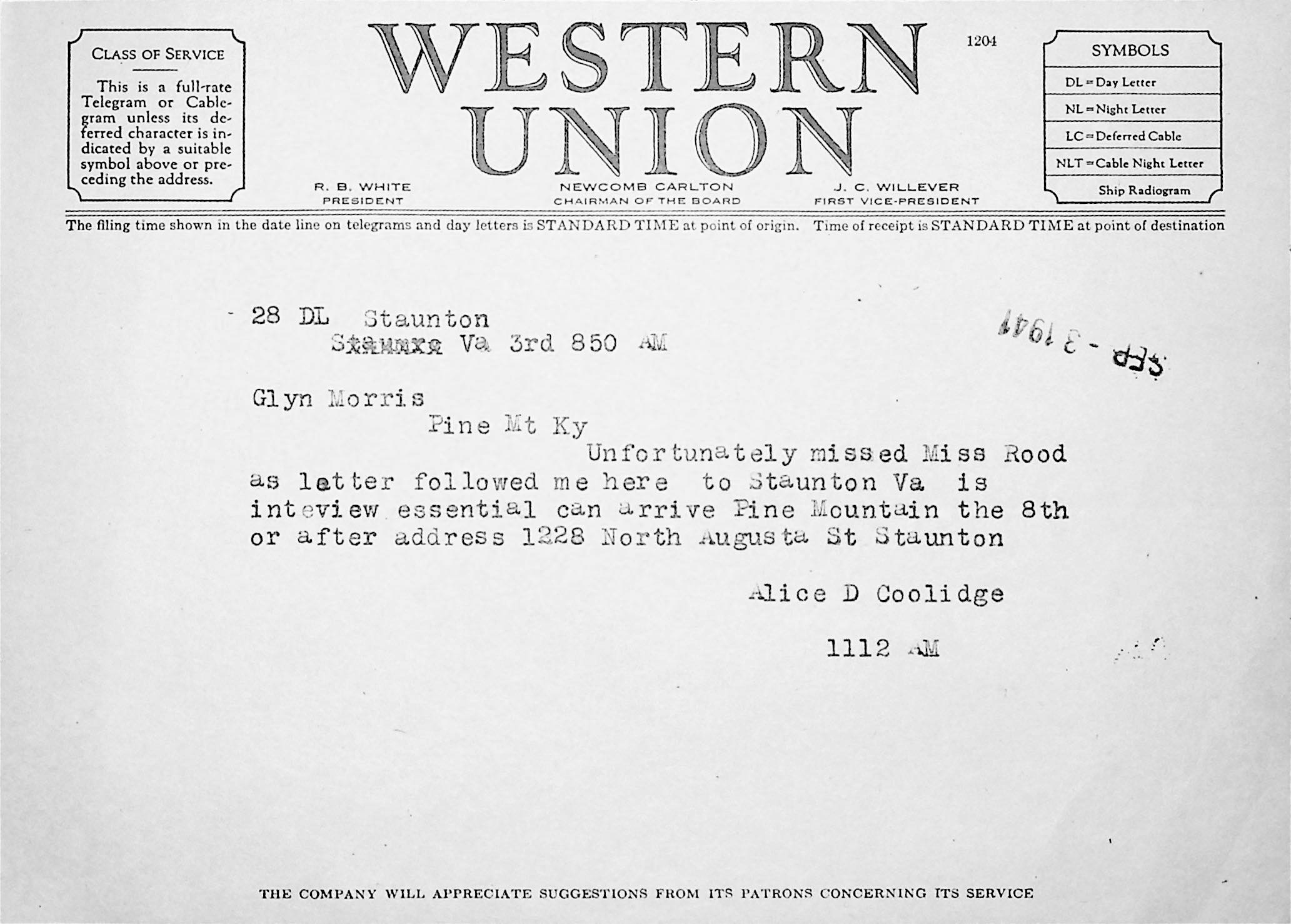 176 [image00176.jpg] Telegram to Morris from Coolidge in Staunton, VA, September 3, 1941. She missed interview with Miss Rood; asks if an interview is essential; states when she can arrive at Pine Mountain.