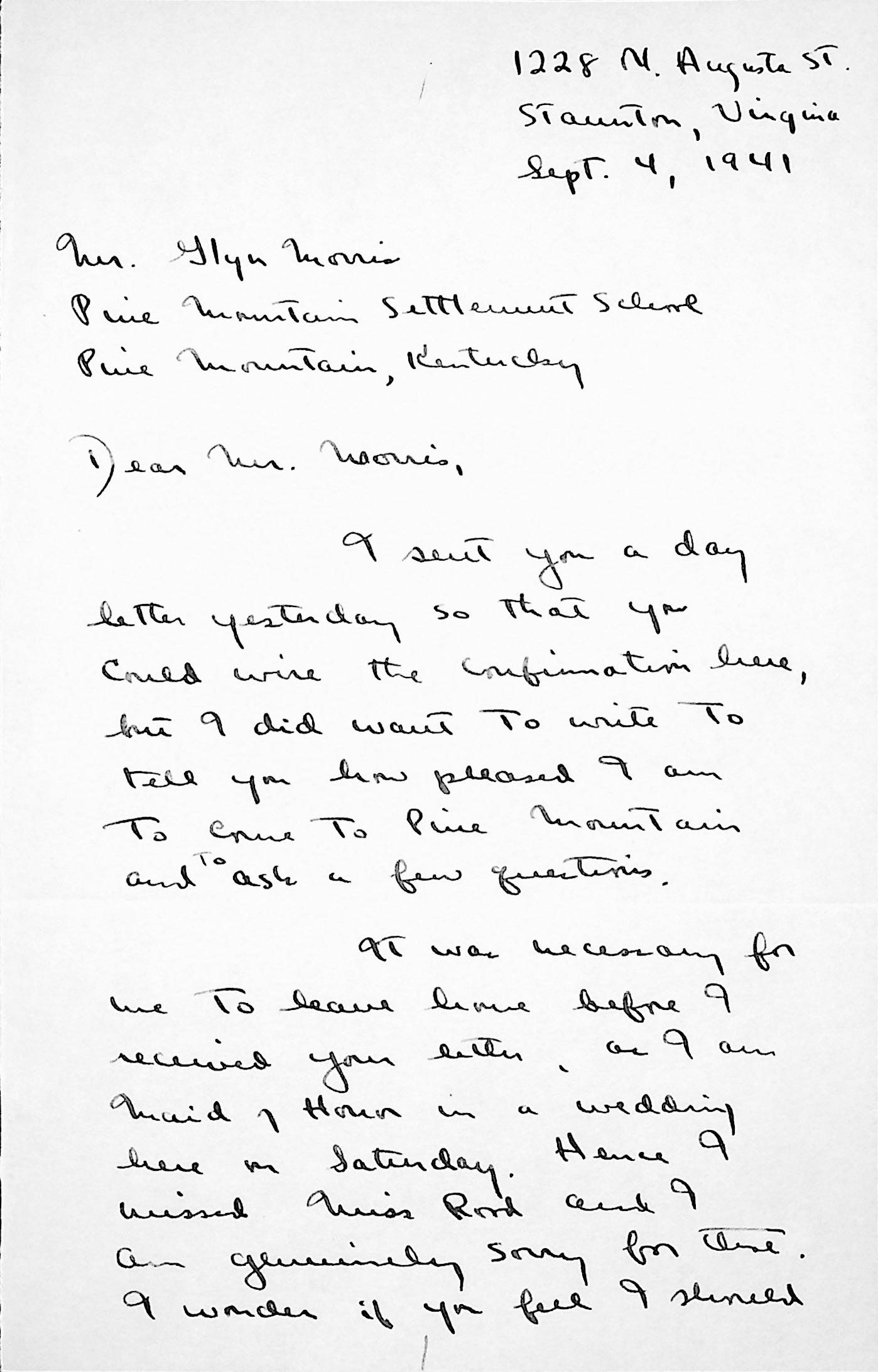 177 [image00177.jpg] and 178 [image00178.jpg] Pages 1 and 2 of handwritten letter to Morris from Coolidge in Staunton, VA, September 4, 1941. She is pleased to come to Pine Mountain for a year; explains how she missed Miss Rood and asks how she may still meet with her; asks for train directions.