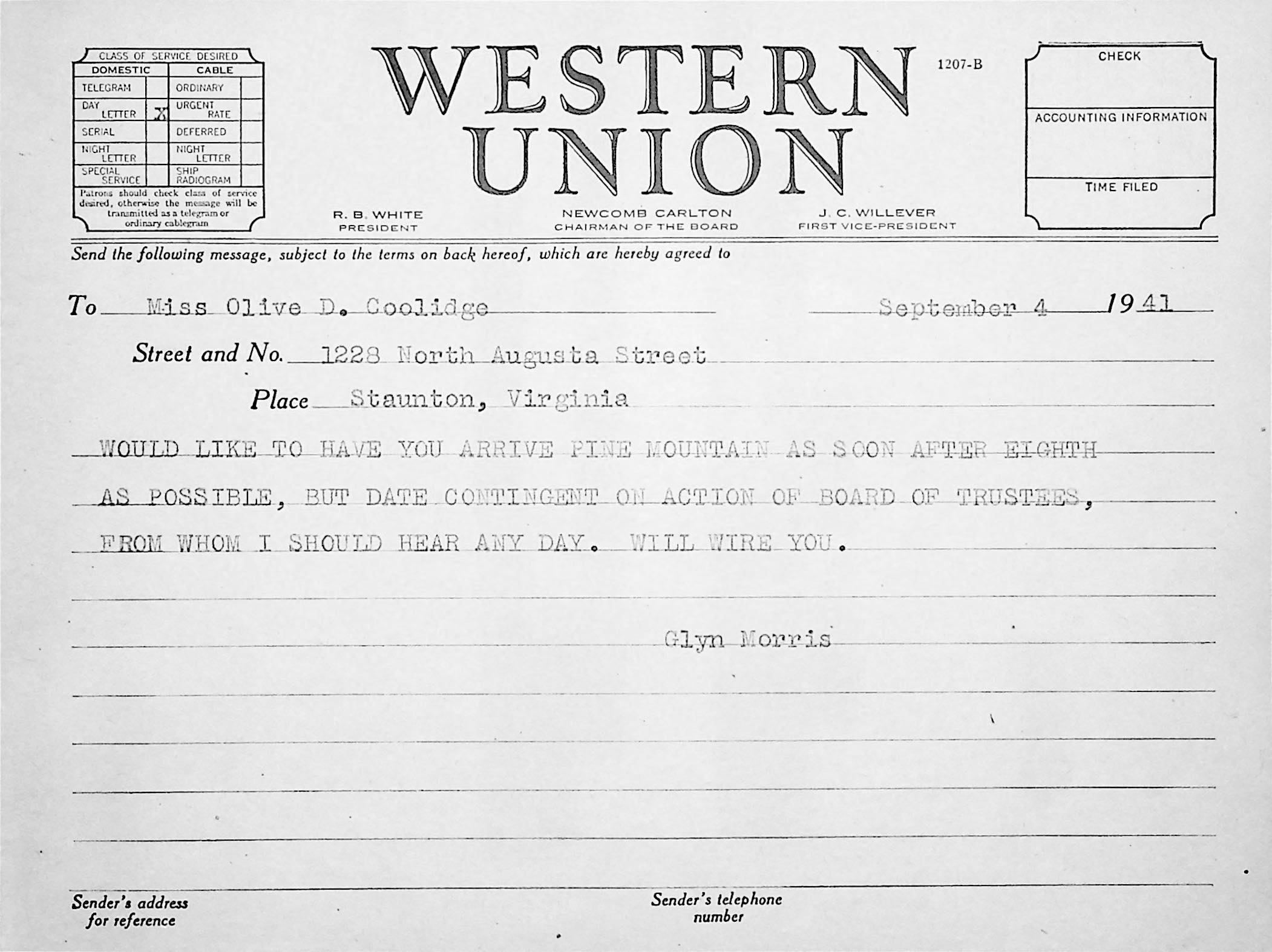 179 [image00178.jpg] Telegram to Coolidge in Staunton, VA, from Morris, September 4, 1941, stating preferred arrival date, contingent on Trustees’ response.