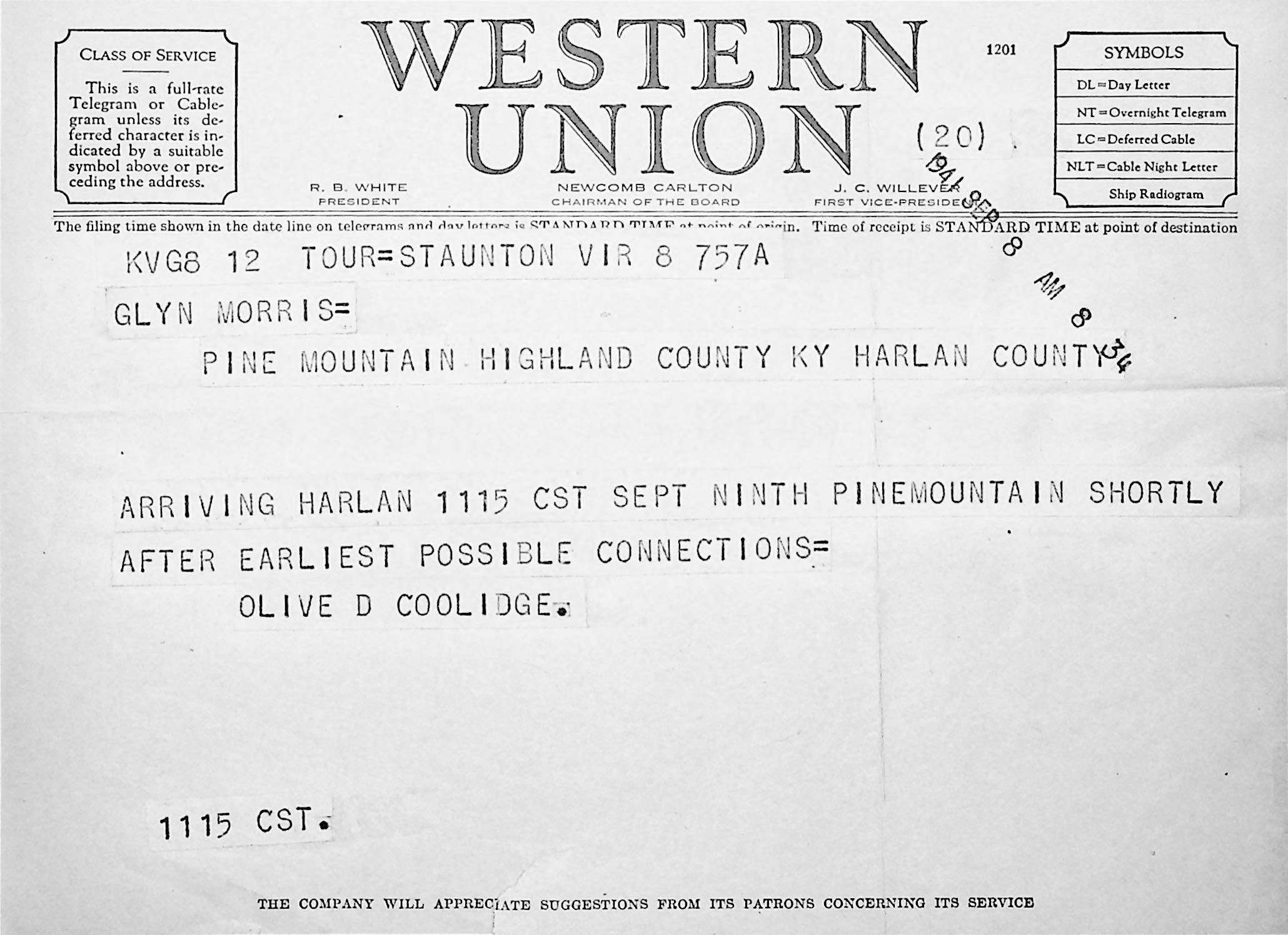 181 [image00181.jpg] Telegram to Morris from Coolidge in Staunton, VA, September 8, 1941, announcing arrival date.