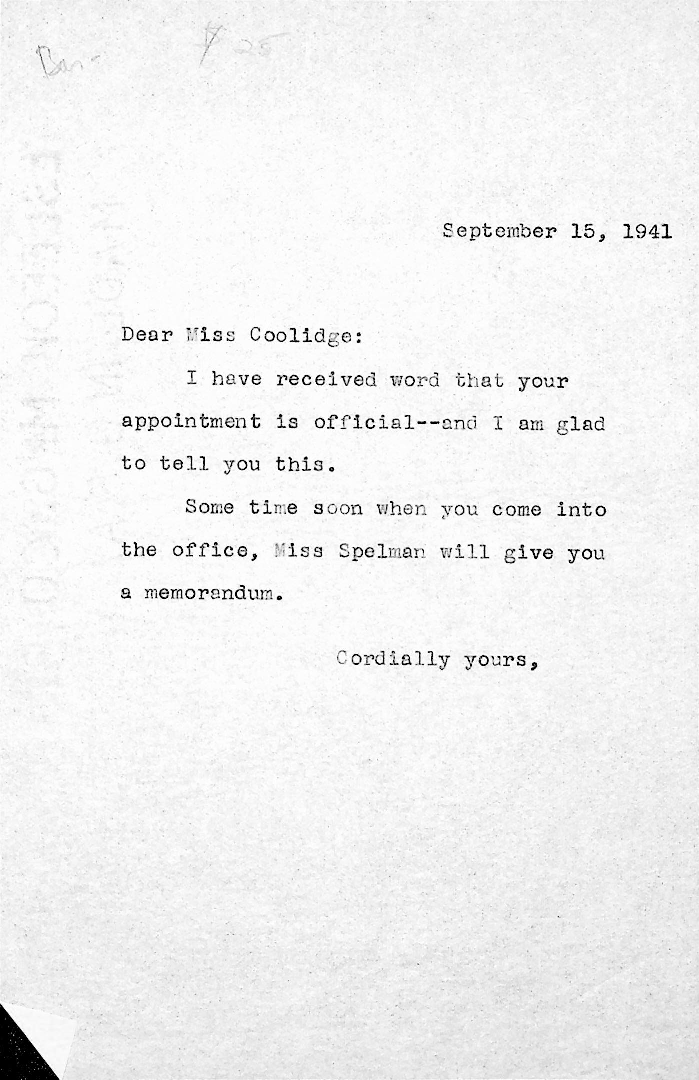 182 [image00182.jpg] Note from [unsigned, likely Morris] to Coolidge, September 15, 1941, stating that her appointment is official; will receive memo from Miss Spelman.