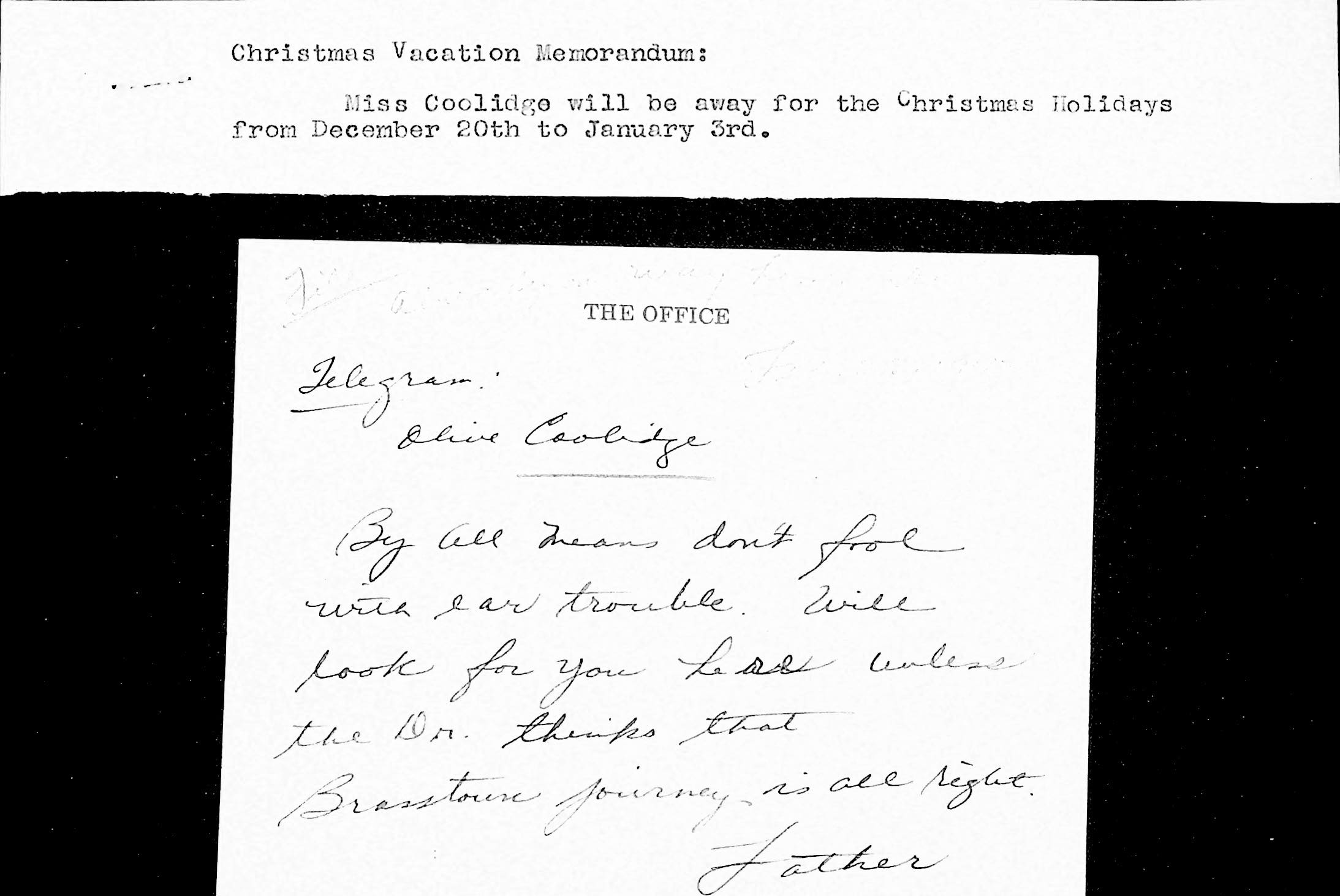 186 [image00186.jpg] Two documents: (1) Christmas Vacation Memorandum, stating dates that Coolidge will be away. (2) A handwritten note from THE OFFICE: “Telegram: Olive Coolidge. By all means don’t fool with ear trouble. Will look for you here unless the Dr. thinks that Brasstown journey is all right. Father.”
