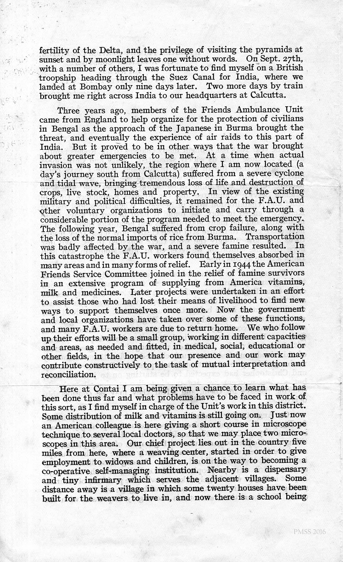 Three years ago, members of the Friends Ambulance Unit came from England to help organize for the protection of civilians in Bengal as the approach of the Japanese in Burma brought the threat, and eventually the experience of air raids to this part of India. But it proved to be in other ways that the war brought about greater emergencies to be met. At a time when actual invasion was not unlikely, the region where I am now located (a day’s journey south from Calcutta) suffered from a severe cyclone and tidal wave, bringing tremendous loss of life and destruction of crops, live stock, homes and property. In view of the existing military and political difficulties, it remained for the F.A.U. and other voluntary organizations to initiate and carry through a considerable portion of the program needed to meet the emergency. The following year, Bengal suffered from crop failure, along with the loss of the normal imports of rice from Burma. Transportation was badly affected by the war, and a severe famine resulted. In this catastrophe the F.A.U. workers found themselves absorbed in many areas and in many forms of relief. Early in 1944 the American Friends Service Committee joined in the relief of famine survivors in an extensive program of supplying from America vitamins, milk and medicines. Later projects were undertaken in an effort to assist those who had lost their means of livelihood to find new ways to support themselves once more. Now the government and local organizations have taken over some of these functions, and many F.A.U. workers are due to return home. We who follow up their efforts will be a small group, working in different capacities and areas, as needed and fitted, in medical, social, educational or other fields, in the hope that our presence and our work may contribute constructively to the task of mutual interpretation and reconciliation.