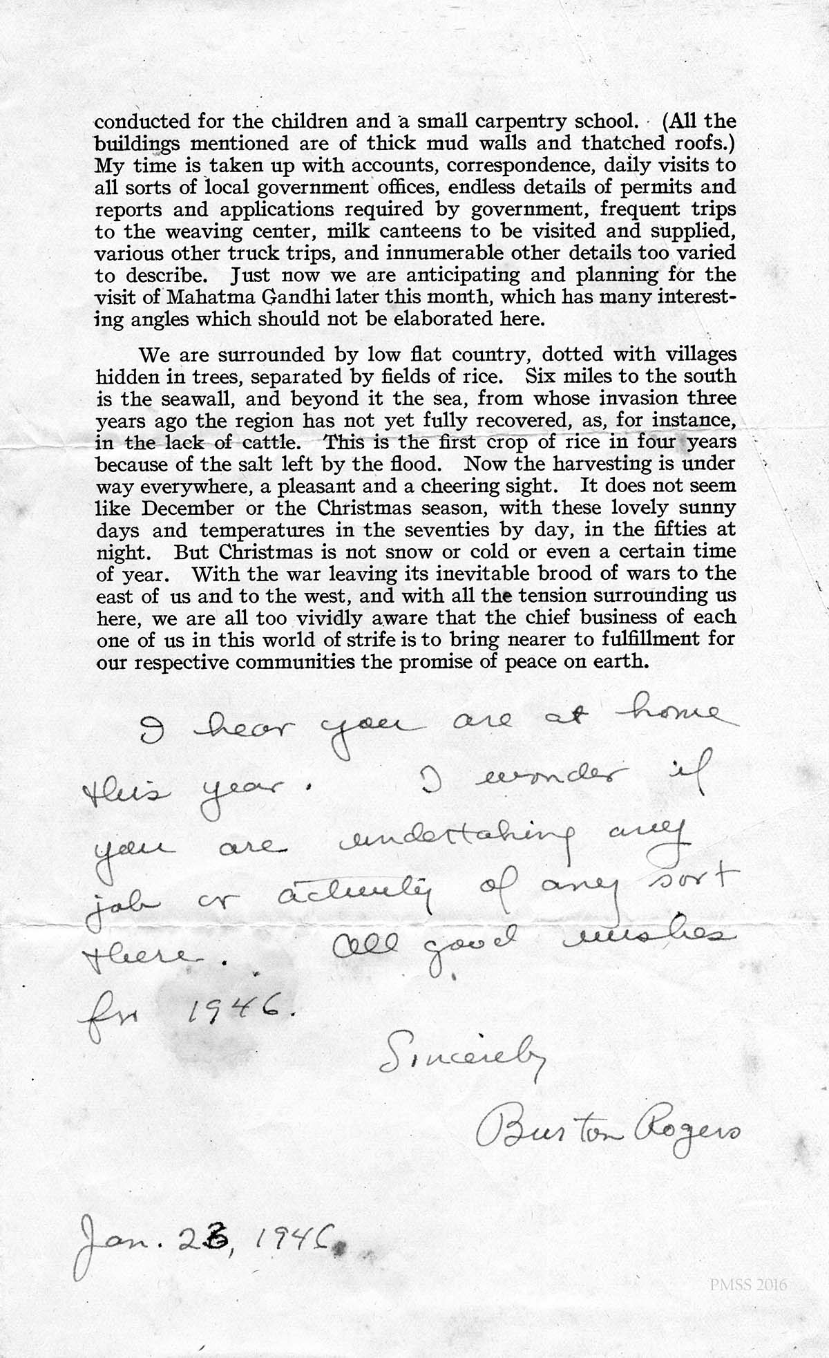 …conducted for the children and a small carpentry school. (All the buildings mentioned are of thick mud walls and thatched roofs.) My time is taken up with accounts, correspondence, daily visits to all sorts of local government offices, endless details of permits and reports and applications required by government, frequent trips to the weaving center, milk canteens to be visited and supplied, various other truck trips, and innumerable other details too varied to describe. Just now we are anticipating and planning for the visit of Mahatma Gandhi later this month, which has many interesting angles which should not be elaborated here.