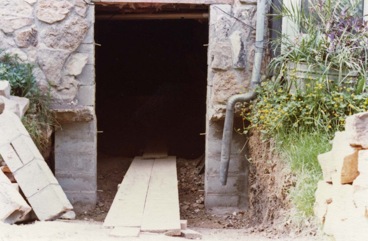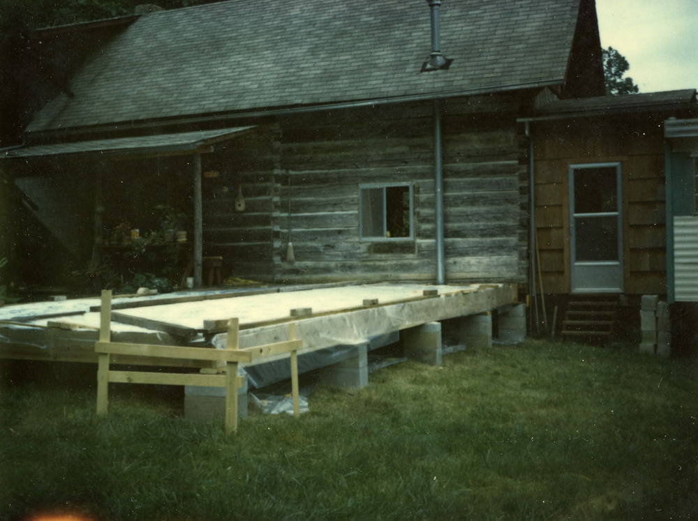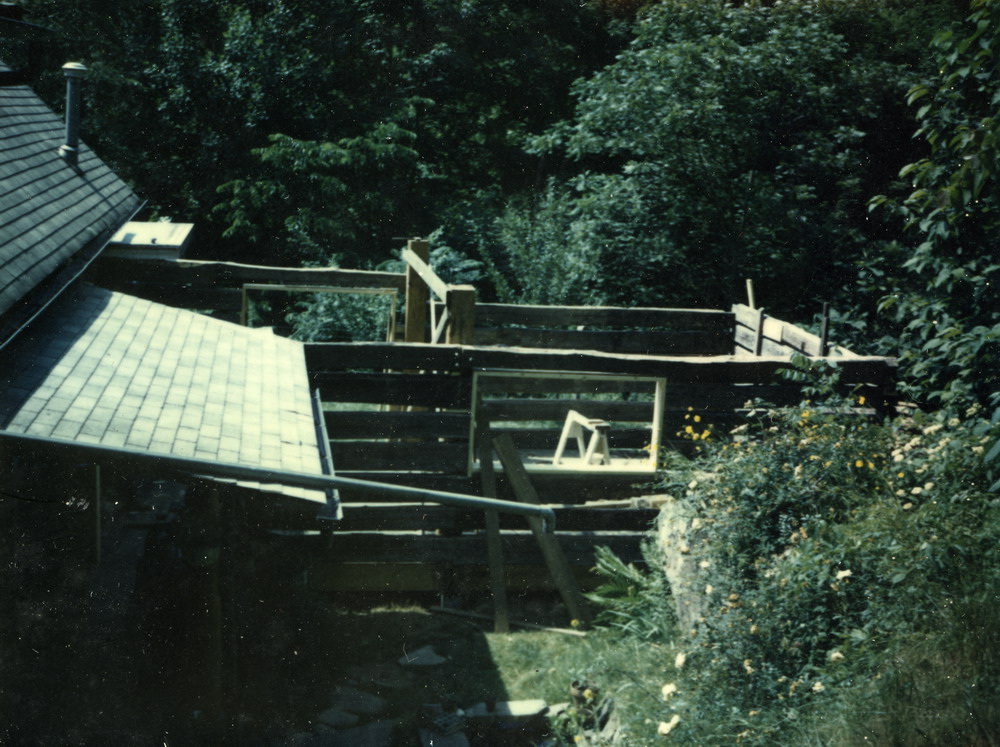 The structures were integrated during two building initiatives. While the first structure, comprised of two cabins, was under construction, a trailer served the needs of the kitchen and temporary bathroom. An upper basement and storage area with two outside entrances was attached to the back hillside of the now unified cabin. A room above the upper basement was added to serve as a bedroom and was joined with the upper attic of the cabin during this first phase of construction.