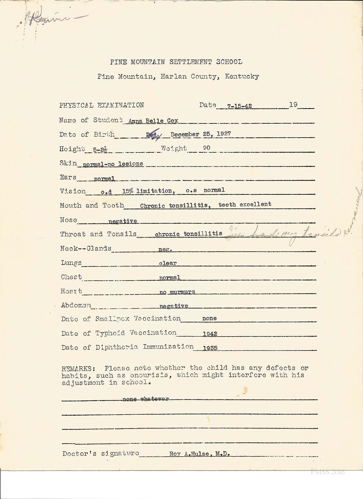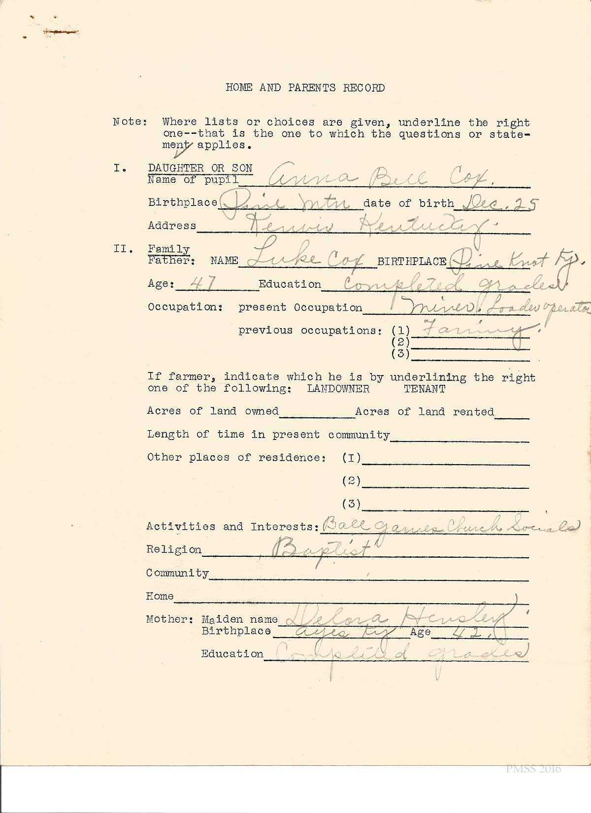 Anna Belle was the third child of Luke and Delora to attend Pine Mountain Settlement School. Eula Gray Cox and her younger brother, Billy Cox, were admitted in 1925.
