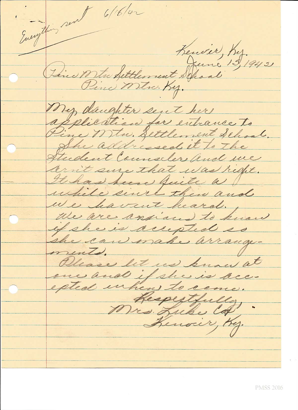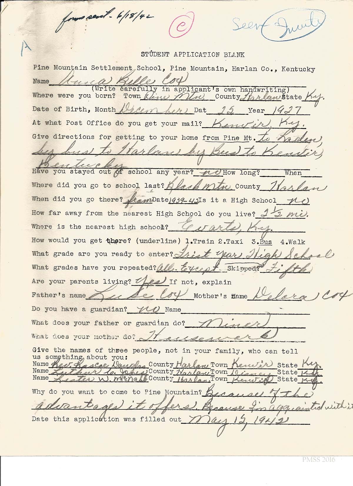 Anna Belle Cox correspondence from June 1940 to June 1942 not only tells of Anna Belle’s steps in applying and gaining admittance to Pine Mountain Settlement School but also relates details of her life and family. The letters and the completed application forms indicate her mother’s endeavors to assure that her 12-year-old daughter receives a good education and Anna Belle’s hopes for her own future.