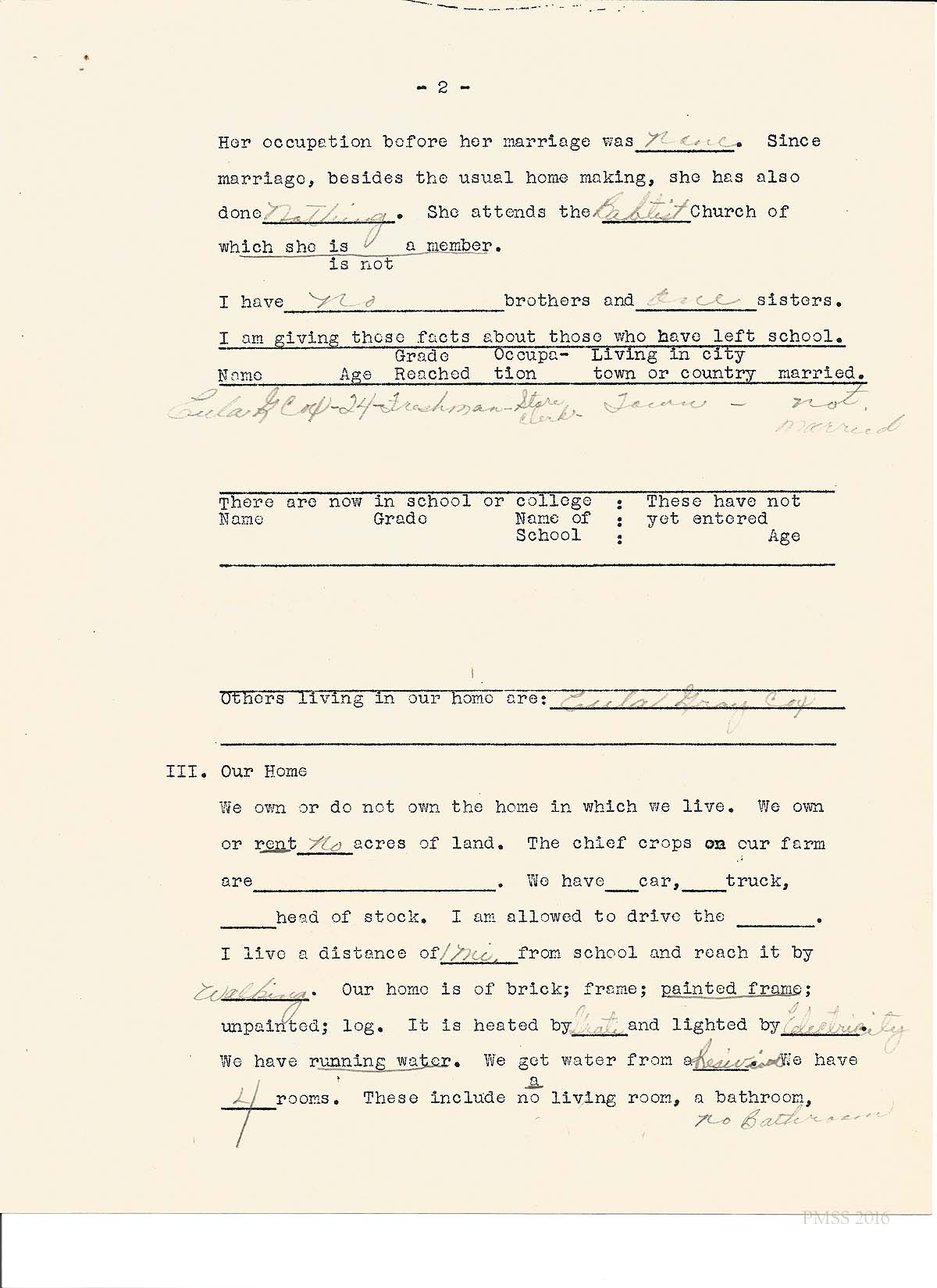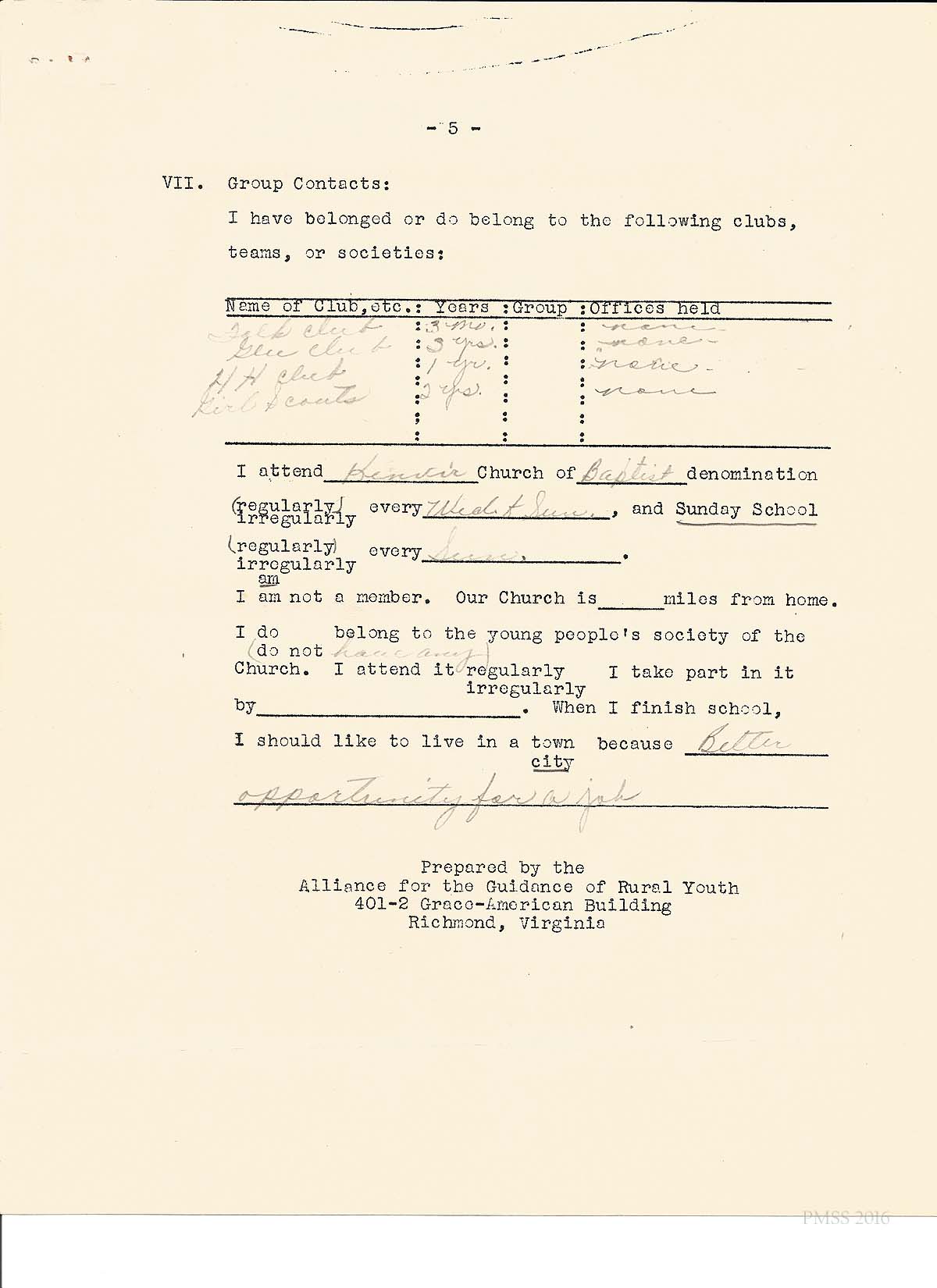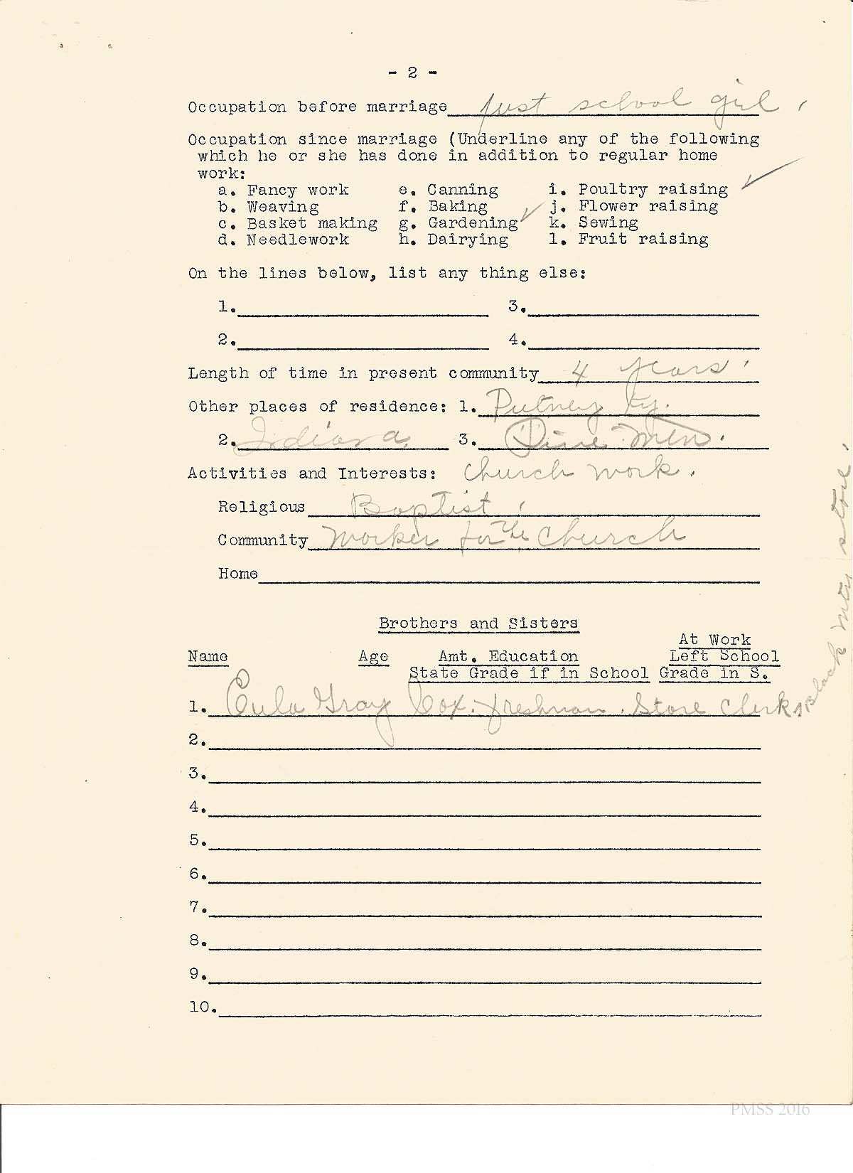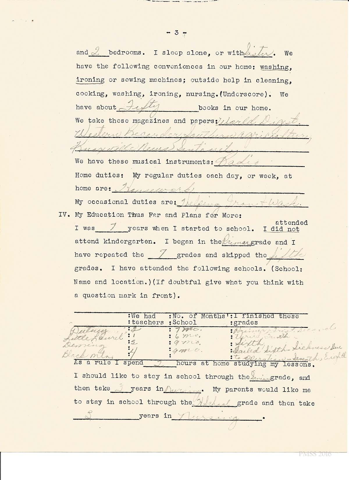 …I began in the primary grade and I have repeated the 7 grades and skipped the fifth grade. I have attended the following schools: Putney, Little Laurel, Deming[?], Black Mtn….I should like to stay in school through the Senior grade, and then take 3 years in nursing….