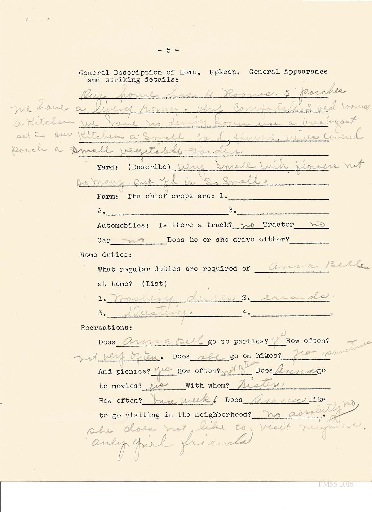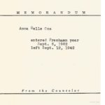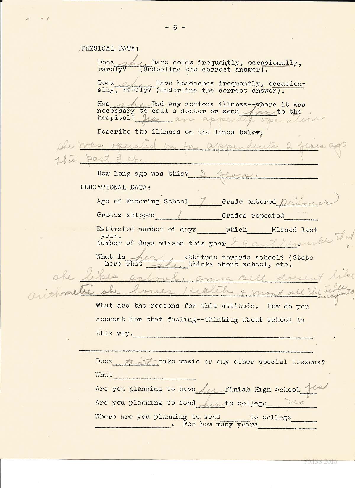 TAGS: Anna Belle Cox correspondence ; student files ; student application blanks ; autobiography forms ; home and parents record forms ; Malcolm M. Arny ; physical examination forms and charts ; SAT test results ;