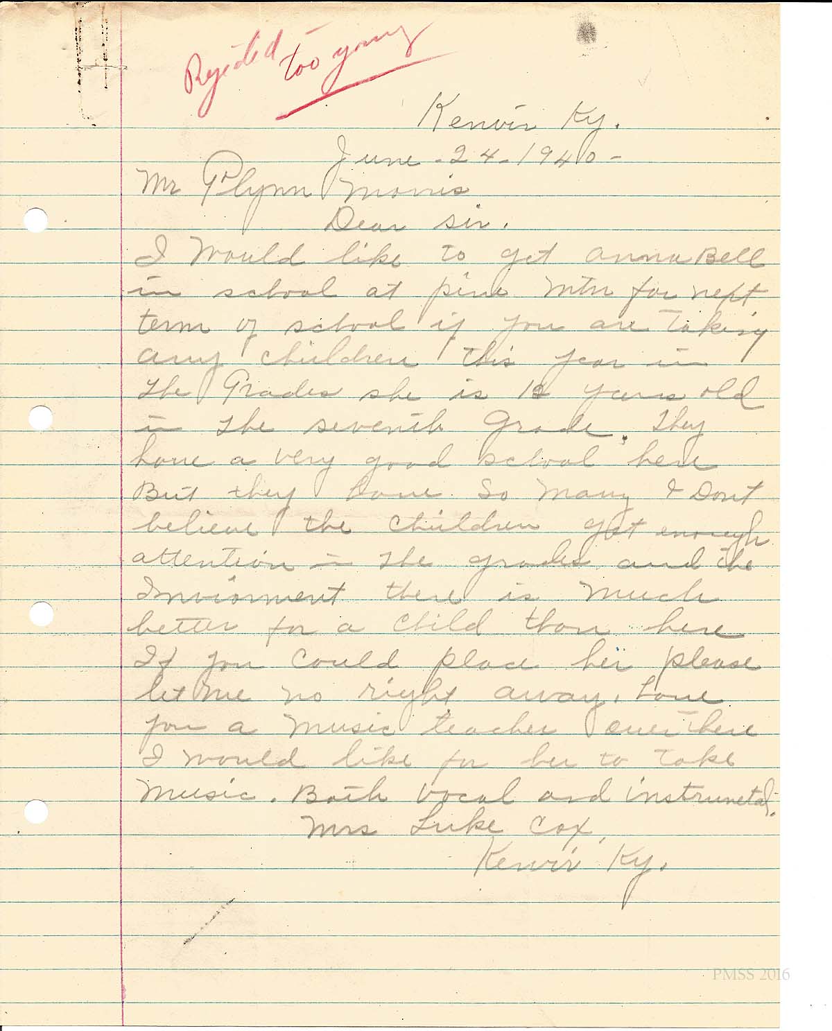 For the past few years we have not had any of the grades here at Pine Mountain school. Because we do not have the facilities for teaching any child in the grades, we shall be unable to accept your daughter Anna Bell. We appreciate your interest in wishing to send your daughter here to school.
