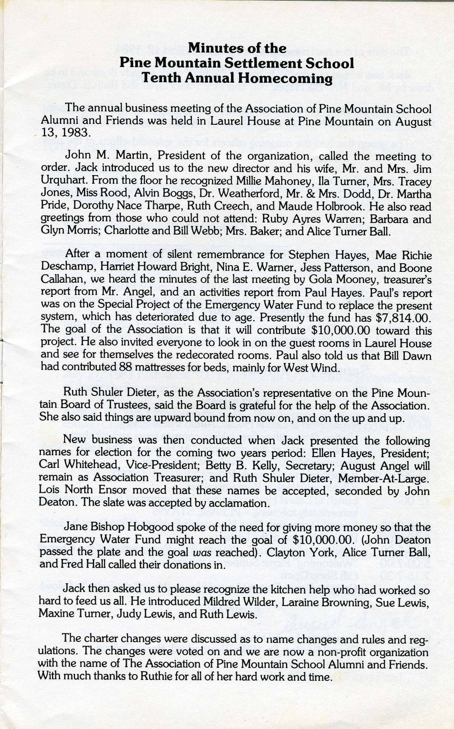 The annual business meeting of the Association of Pine Mountain School Alumni and Friends was held in Laurel House at Pine Mountain on August 13, 1983.