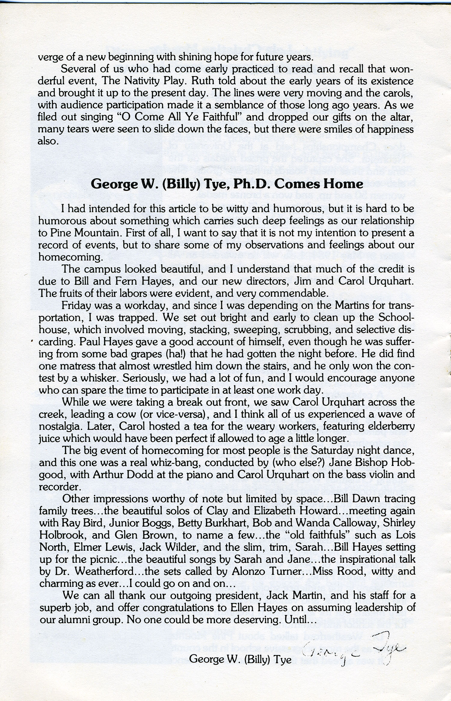 Having now been through our first hectic, fun-filled homecoming weekend, I can now relate to the enthusiasm which you bring each year to Pine Mountain. I found the weekend exciting, tiring (how do you do it?), and full of new and caring persons whom I feel I’ll be able to count on for keeping the spirit of Pine Mountain alive for many more years to come. The chance to share with you, and learn of the rich history and meaning of Pine Mountain to so many of you was an important beginning for Carol and me.