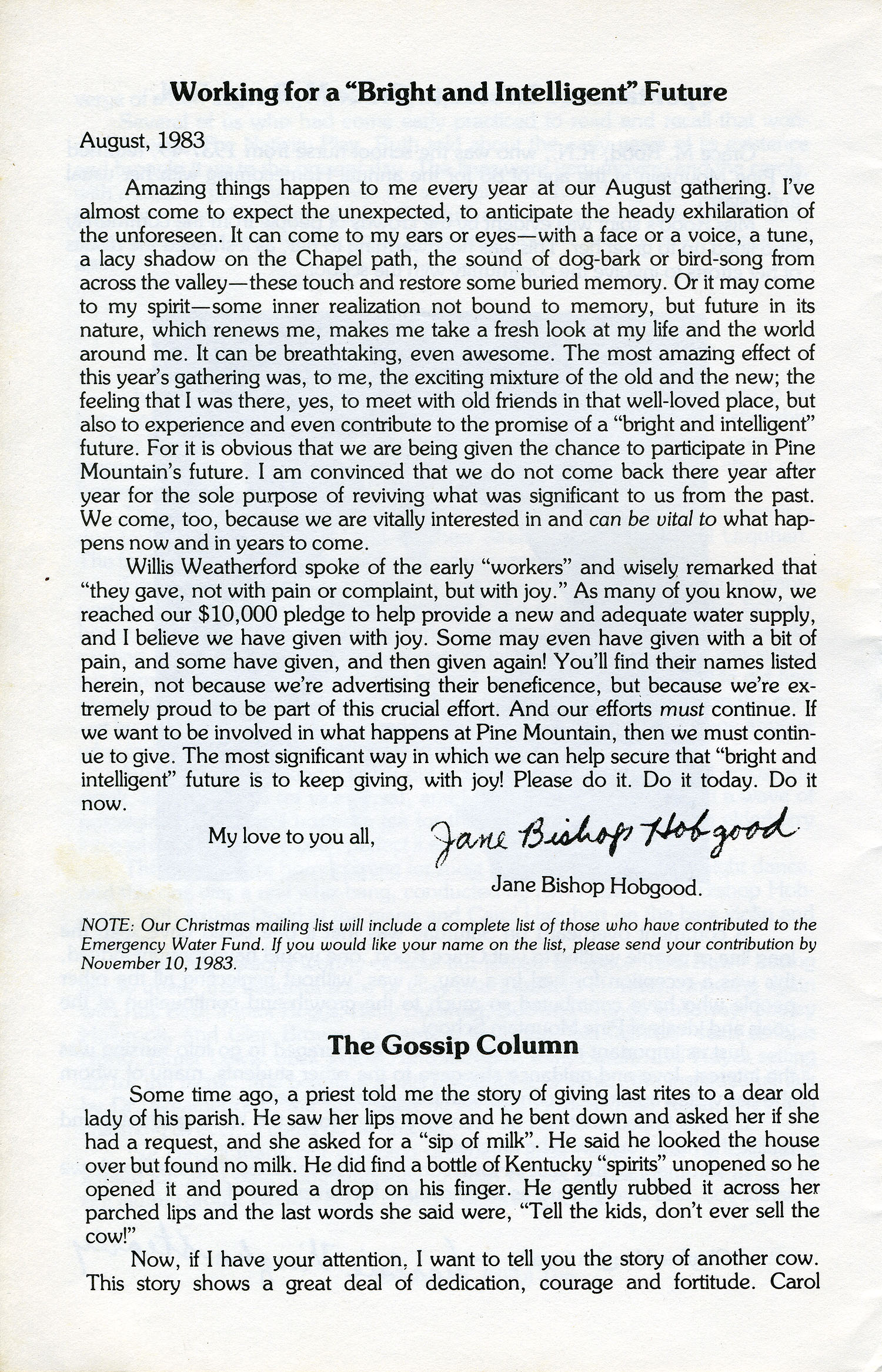 Willis Weatherford spoke of the early “workers” and wisely remarked that “they gave, not with pain or complaint, but with joy.” As many of you know, we reached our $10,000 pledge to help provide a new and adequate water supply, and I believe we have given with joy. Some may even have given with a bit of pain, and some have given, and then given again! You’ll find their names listed herein, not because we’re advertising their beneficence, but because we’re extremely proud to be part of this crucial effort. And our efforts must continue. If we want to be involved in what happens at Pine Mountain, then we must continue to give. The most significant way in which we can help secure that “bright and intelligent” future is to keep giving, with joy! Please do it. Do it today. Do it now.