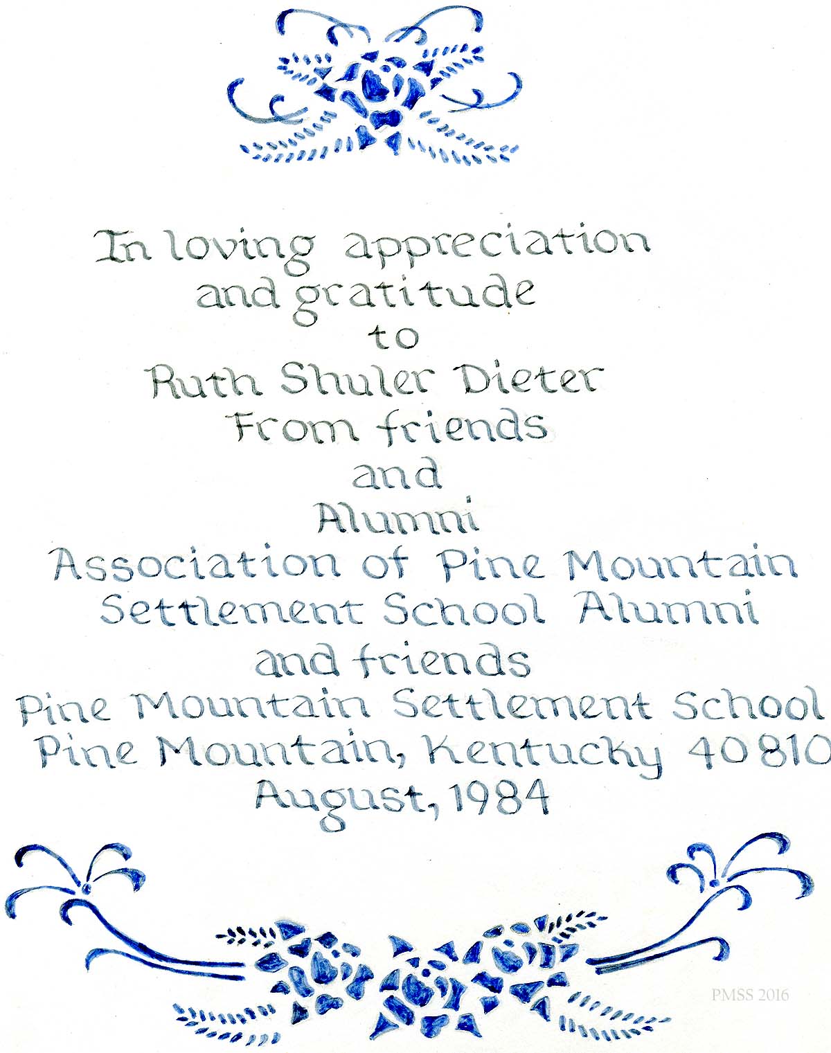 In loving appreciation and gratitude to Ruth Shuler Dieter from friends and Alumni, Association of Pine Mountain Settlement School Alumni and Friends, Pine Mountain Settlement School, Pine Mountain, Kentucky 40810, August, 1984