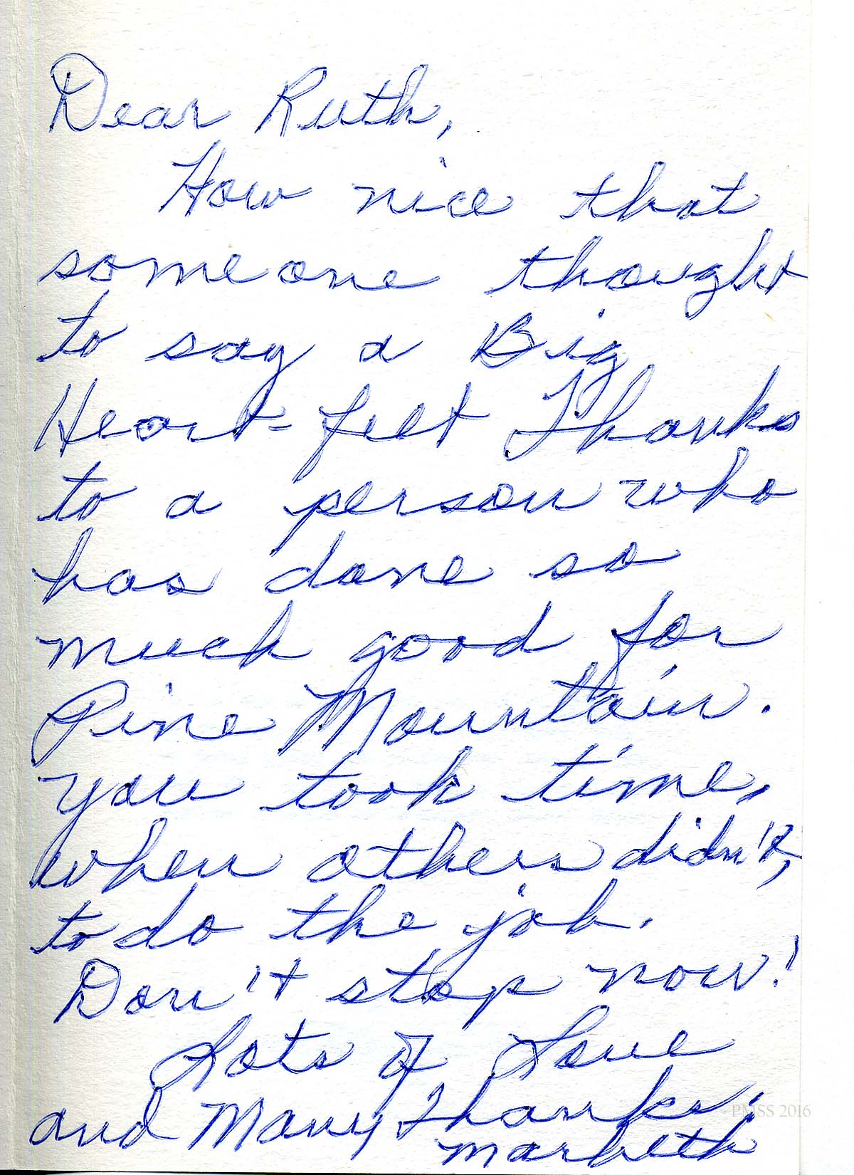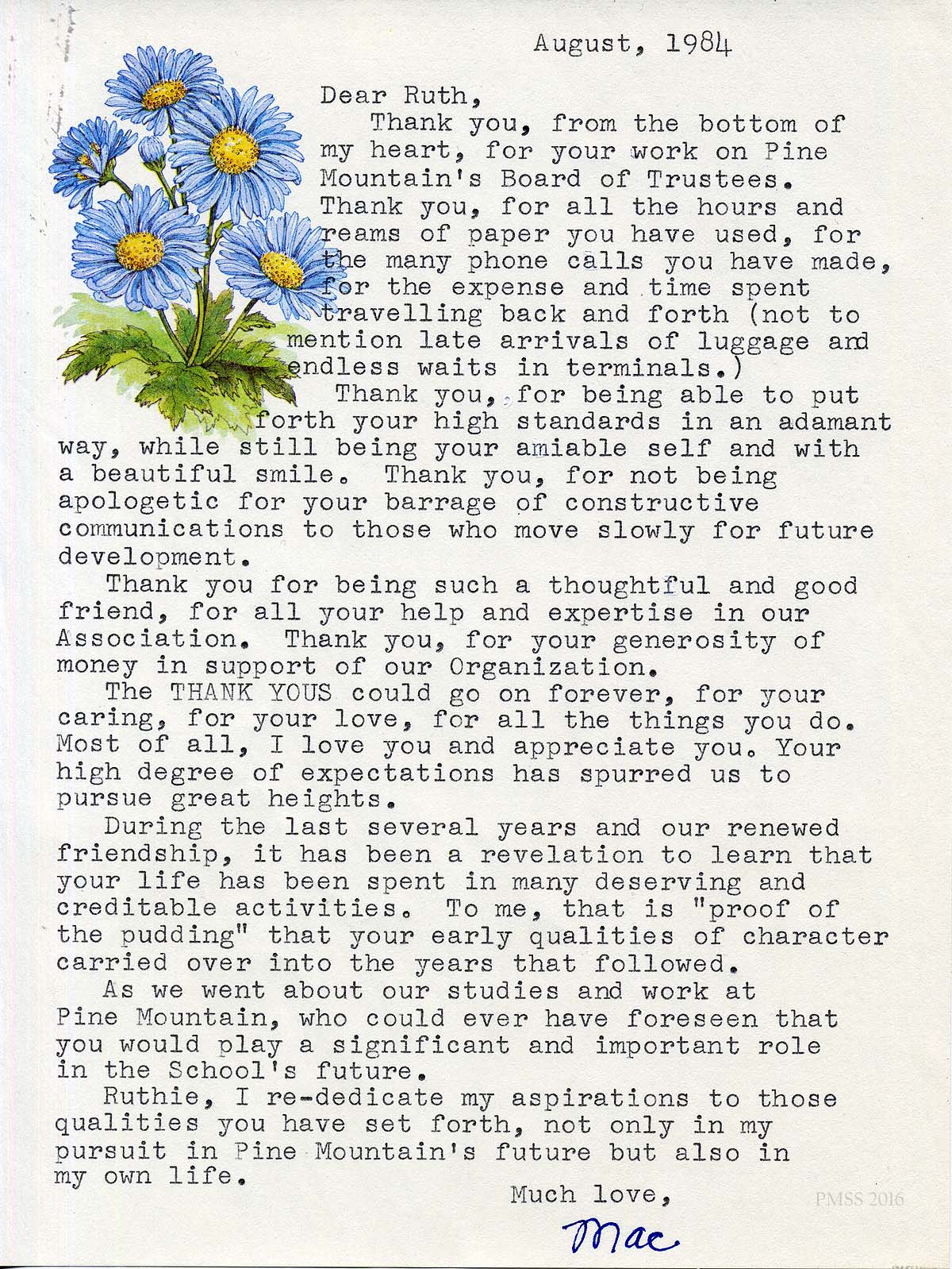[schuler_mem_008.jpg] Typed letter signed “Mac,” dated August 1984. Thanks to Ruth for her various PMSS activities and good qualities.