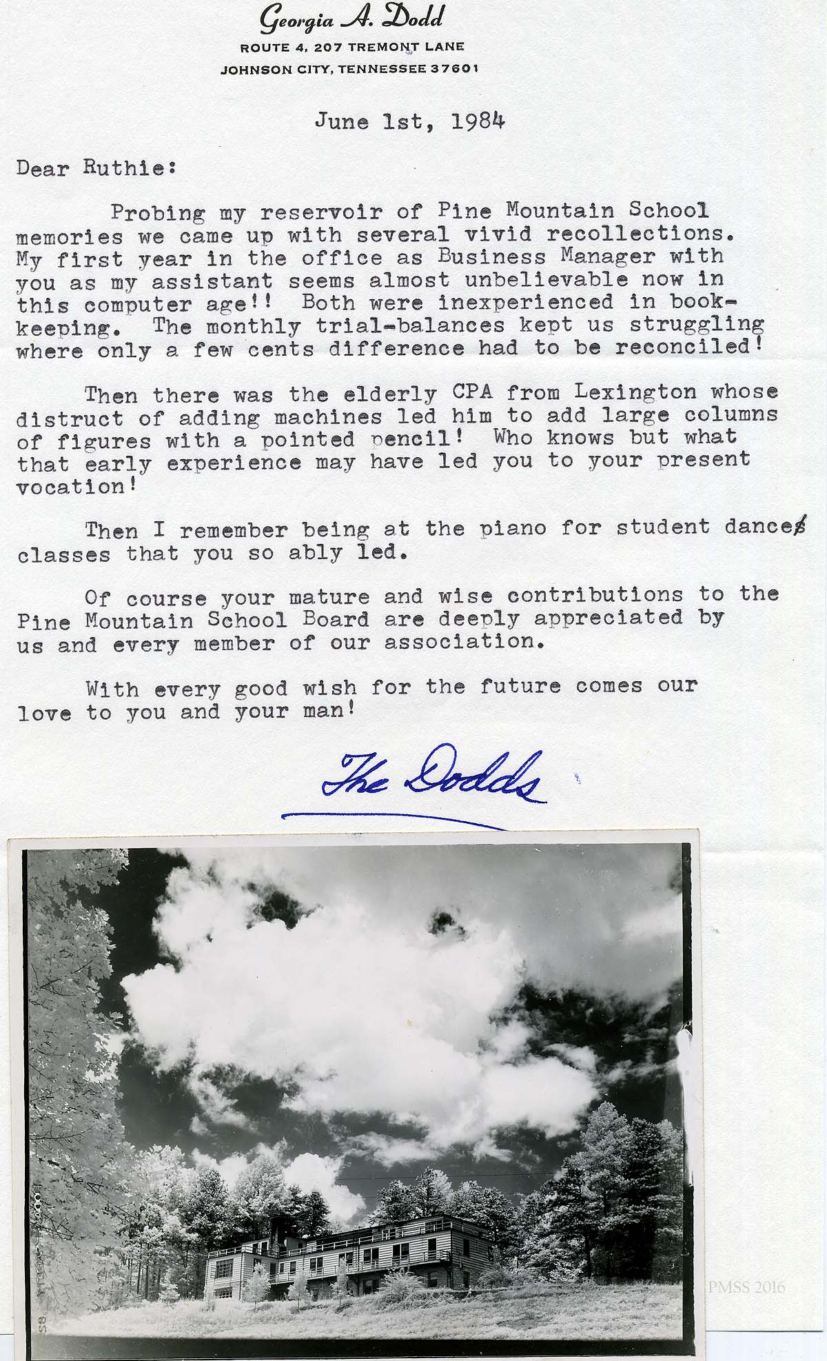 [schuler_mem_006.jpg] Typed letter with header: “Georgia A. Dodd…Johnson City, TN 37601,” dated June 1, 1984; with a black/white photo for Boys’ Industrial Building. Georgia describes memories of her first year in the Office as Business Manager and Ruth as her assistant; playing the piano for Ruth’s student dance classes. Signed “The Dodds.”
