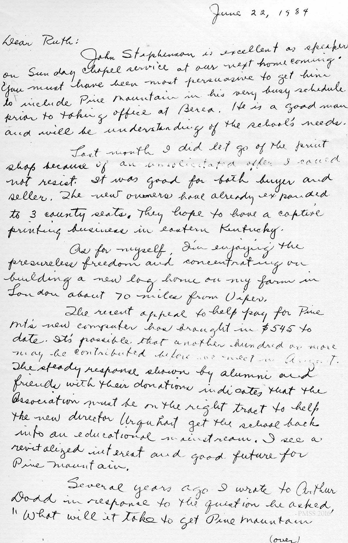 [schuler_mem_007.jpg] Handwritten letter from August Angel, dated June 22, 1984, page 1. Appreciated Ruth’s part in getting John Stephenson to speak at homecoming; updated Ruth on his activities and recent appeal that raised $545 for PMSS’s new computer so far.