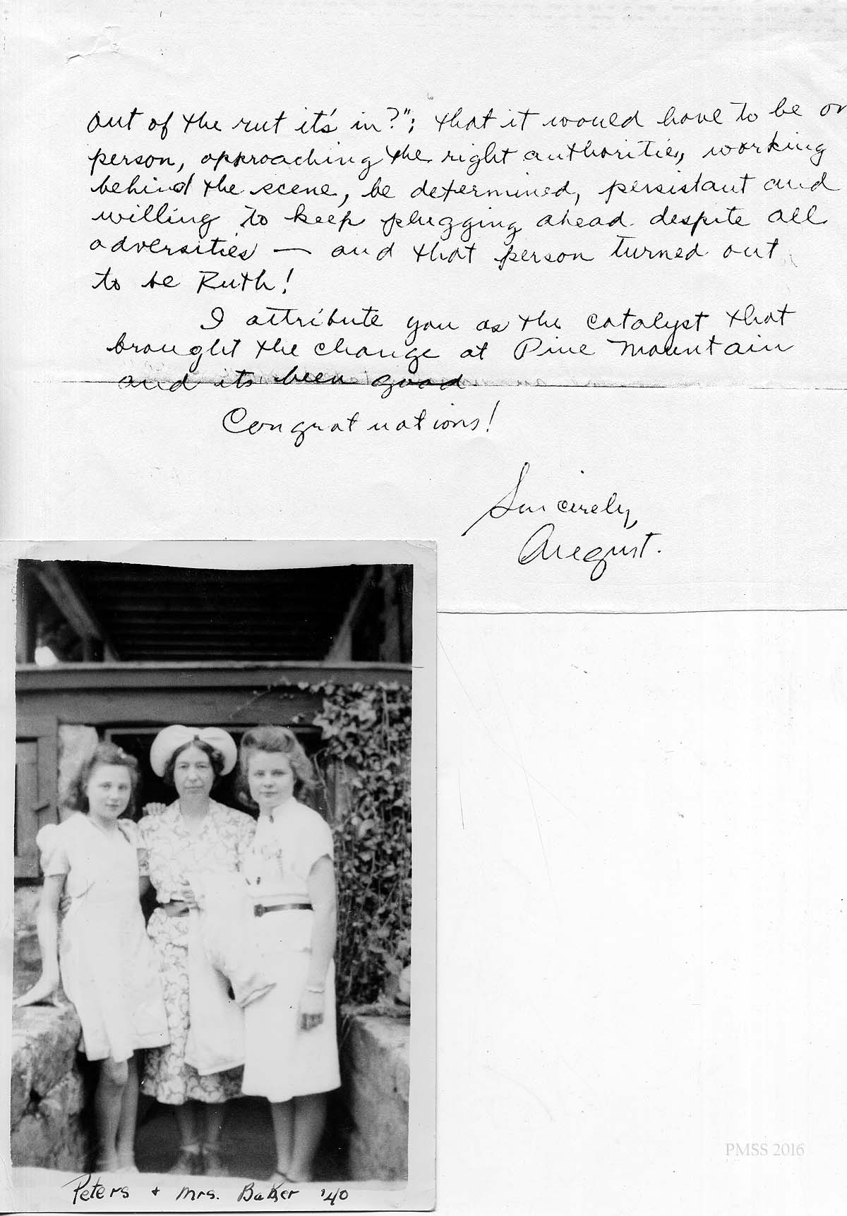 [schuler_mem_007a.jpg] Angel letter, page 2. Attached black/white photograph of 3 women with notation ” Peters & Mrs. Baker ’40.”