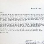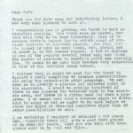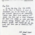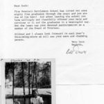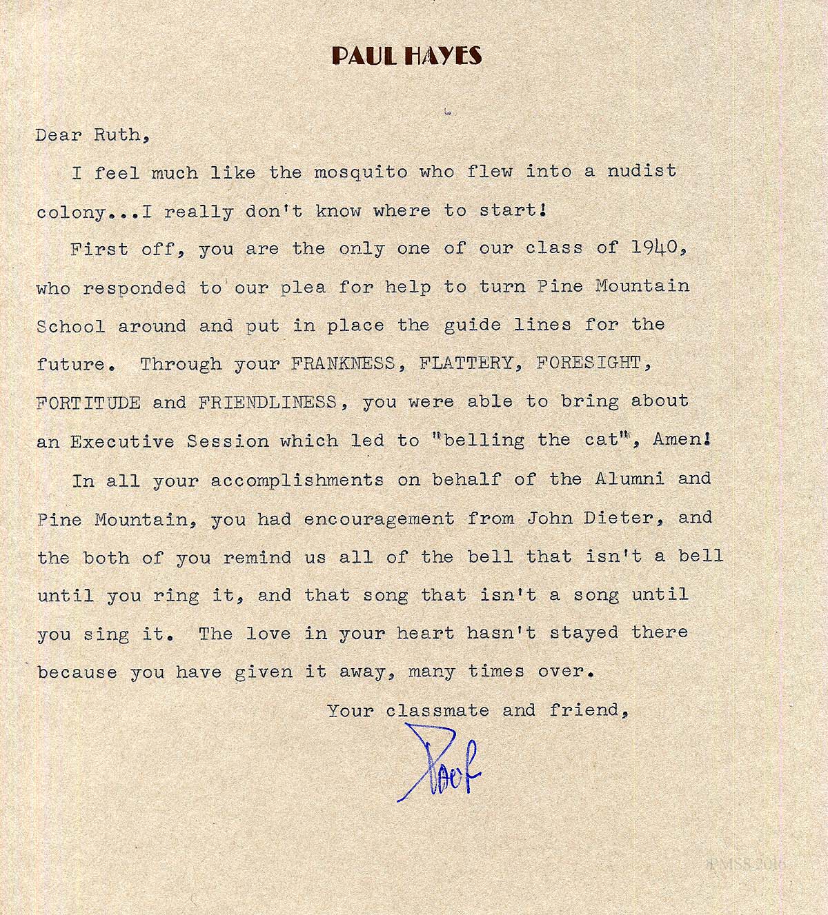[schuler_mem_025.jpg] Typed letter from Paul Hayes, Director, PMSS. Describes memory that Ruth was the only one from Class of 1940 who responded to Paul and Ellen Hayes’ idea to set up an Alumni Association. They met at Ruth’s hometown of Big Stone Gap, VA. Since then Ruth served as financial consultant and Board member, and helped establish and chaired the Advisory Council, visiting the School several times a year.