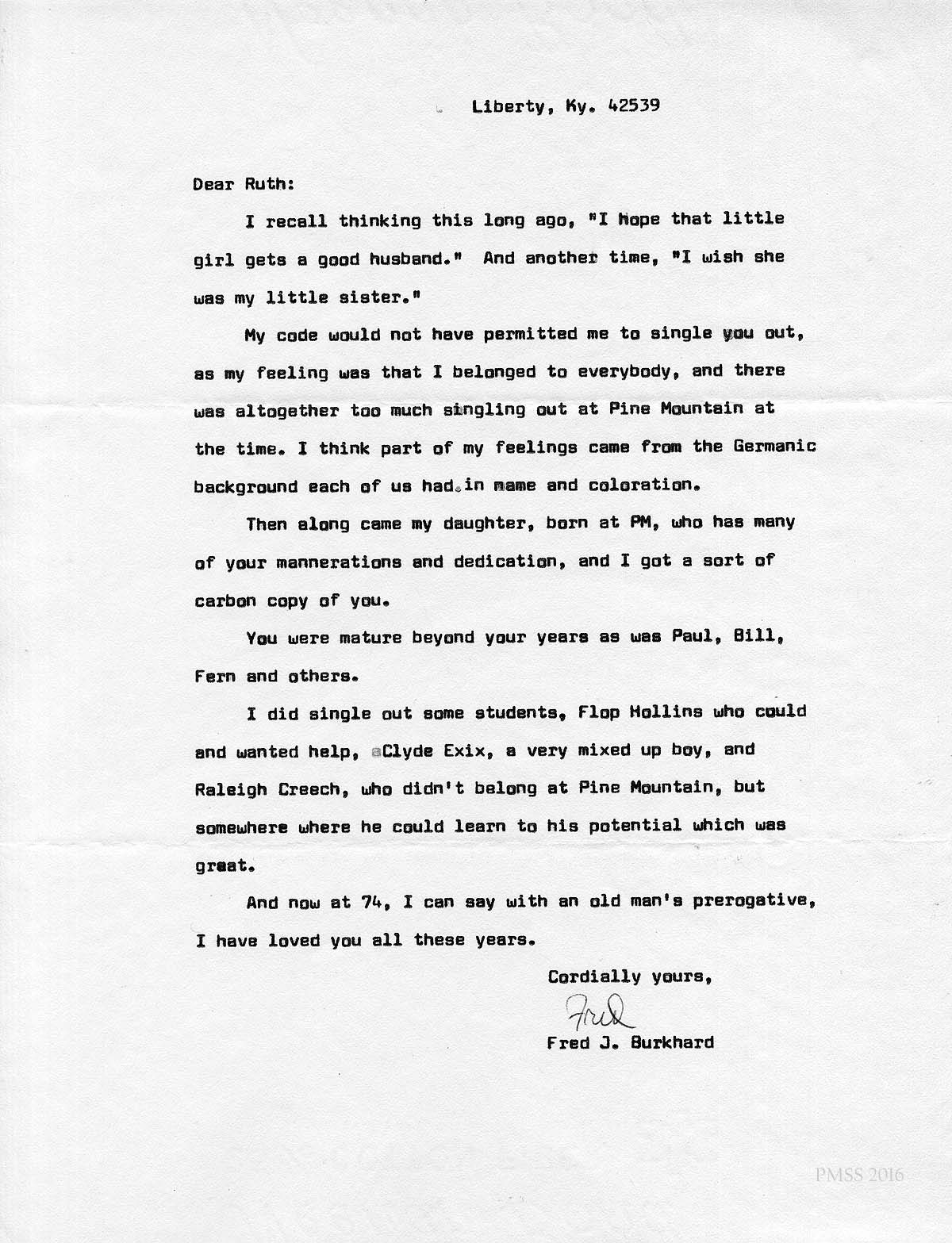[schuler_mem_010.jpg] Typed letter of thanks from Fred J. Burkhard, Liberty, KY. Mentions remembering students Flop Hollins, Clyde Exix, Raleigh Creech.
