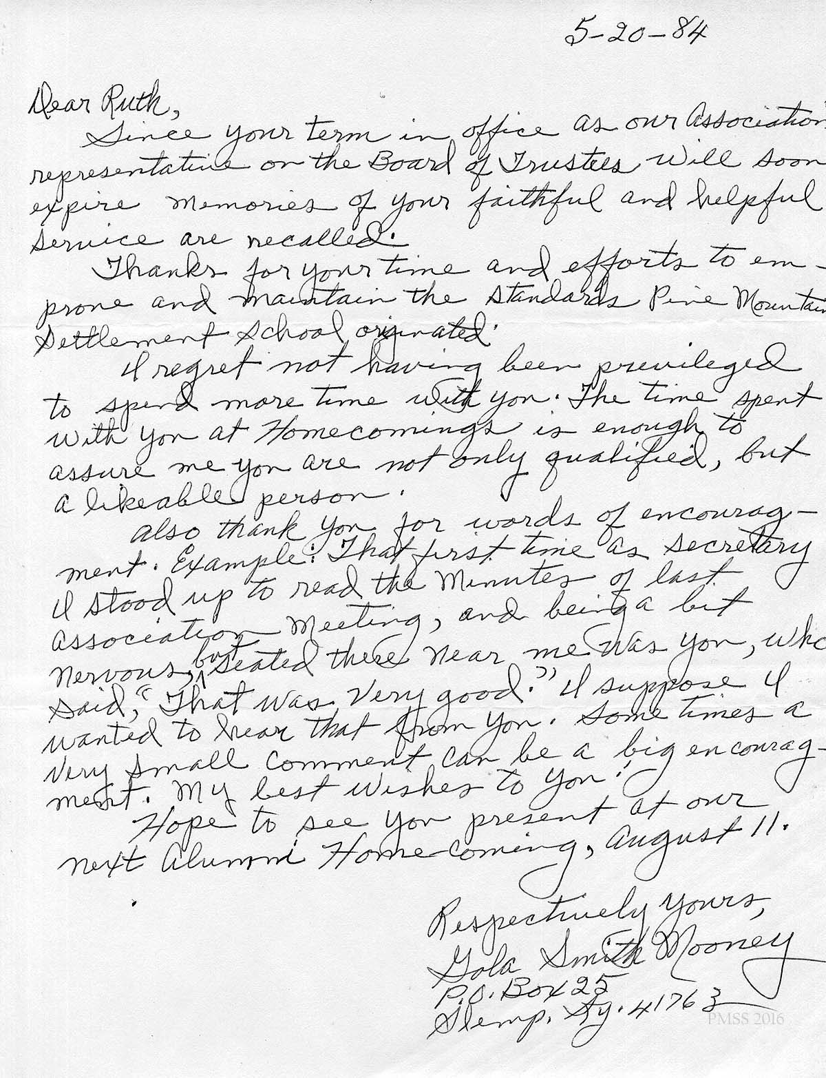 [schuler_mem_012.jpg] Handwritten letter from Gola Smith Mooney, Slemp, KY, 5-20-84. Mentions that Ruth’s term in office as the PMSS Alumni Association representative on the PMSS Board of Trustees will soon expire. As Alumni Assn Secretary, Gola remembers Ruth’s words of encouragement.