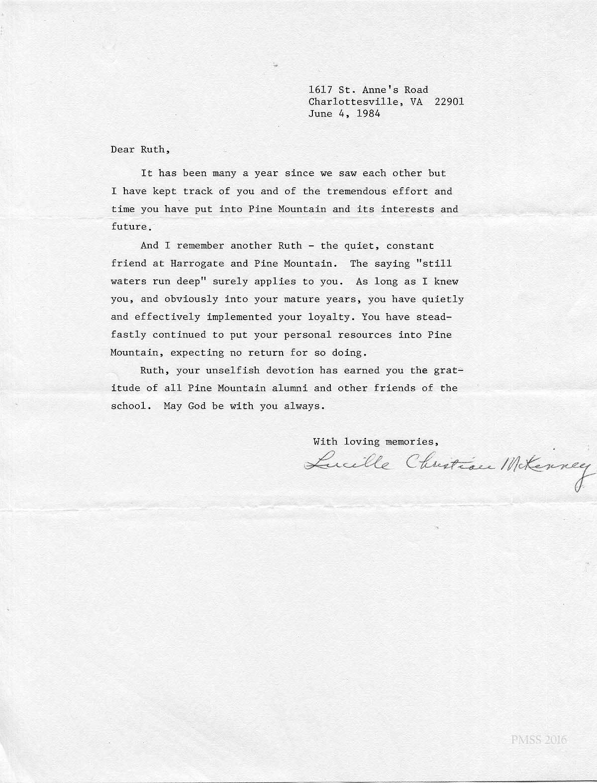 [schuler_mem_013.jpg] Typed letter from Lucille Christian McKinney, Charlottesville, VA, June 4, 1984. Remembers Ruth as friend at Harrogate and Pine Mt.