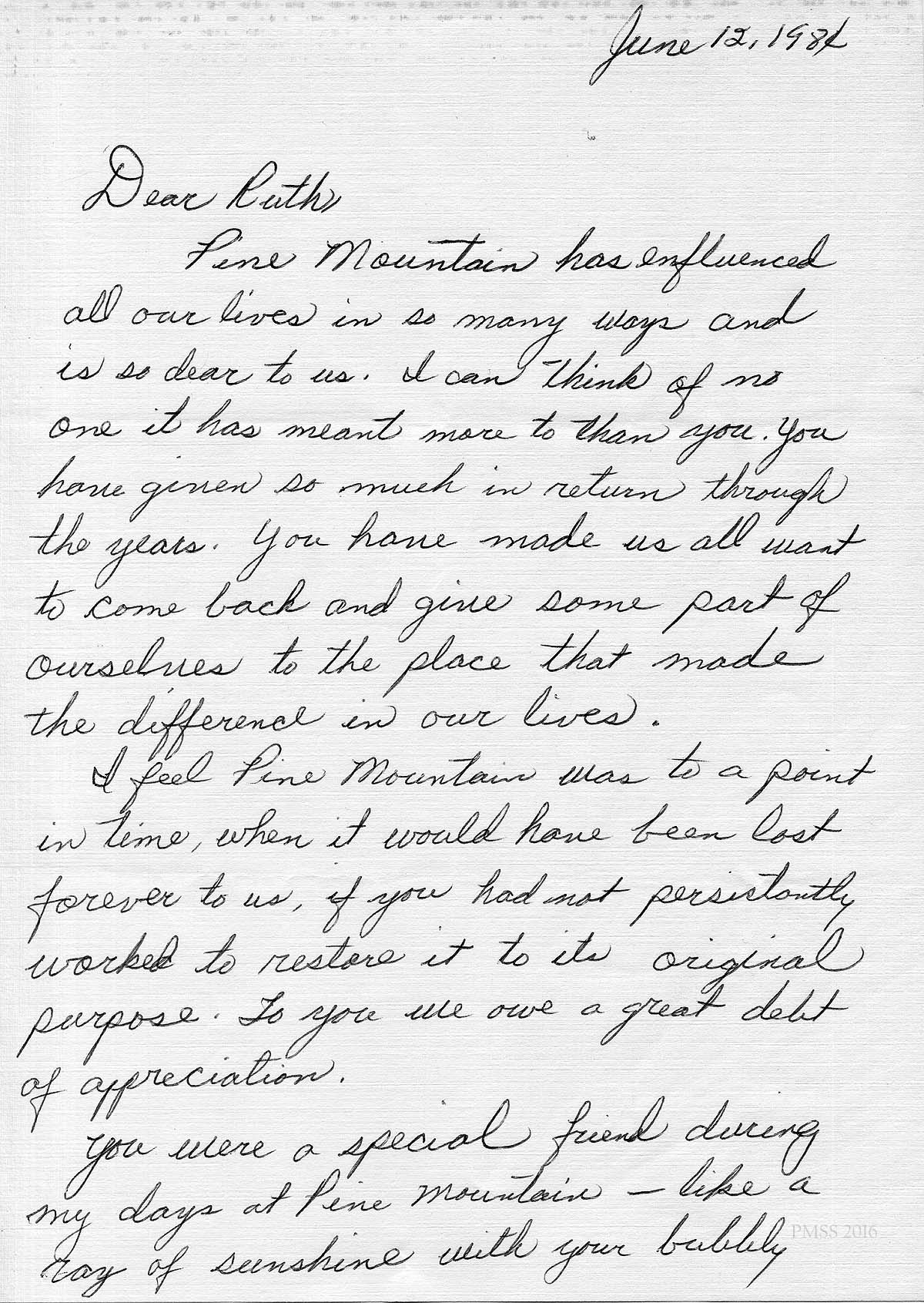 [schuler_mem_016a.jpg] Typed letter from Ruth’s sister, Ginny Nelle, June 1984. “You played a big part of my growing up years at Pine Mountain and were a role model then and now.”