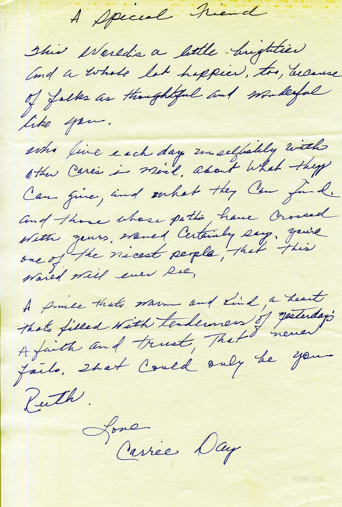 [schuler_mem_015.jpg, 015a and 15b.jpg] Handwritten letter from Carrie Day, titled “A Special Friend.” Color photograph of woman sitting on porch steps, with notation, “Carry Day, Big Creek, KY, Front Porch, Love to Ruth”