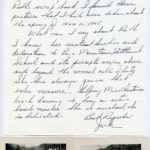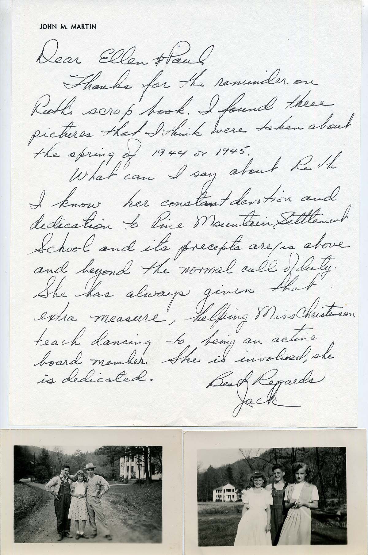 [schuler_mem_019.jpg] Handwritten note with heading “John M. [Mullens] Martin,” addressed to “Ellen & Paul [Hayes],” stating appreciation of Ruth’s devotion and hard work. Remembers Ruth helping Miss [Abbie Winch] Christensen teach dancing. Sent 3 black/white photographs, c. 1944 or 1945, of groups of 3 young people in front of the School House. Signed “Jack.”