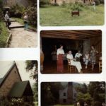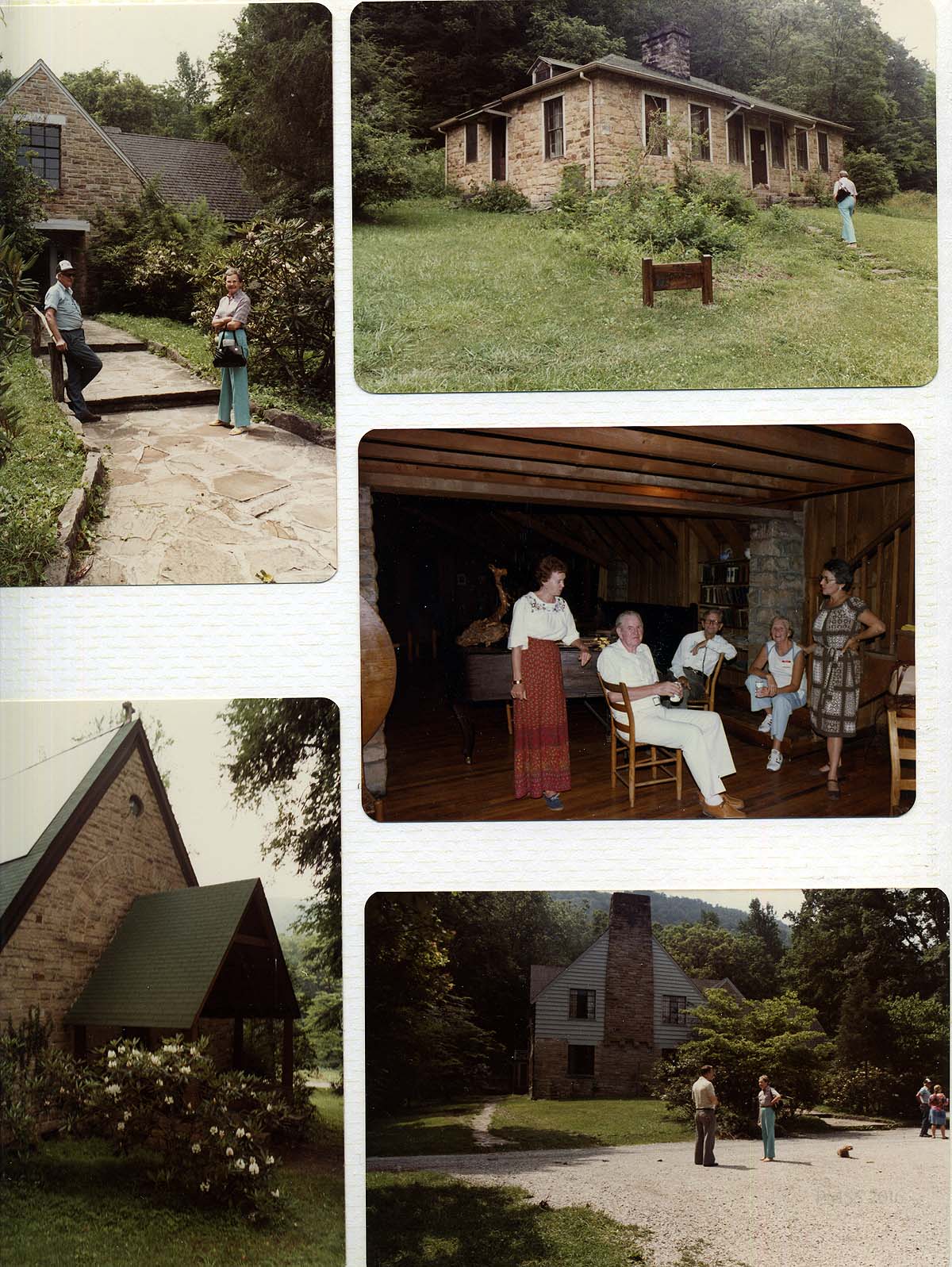 [schuler_mem_020.jpg] Page with 5 color photographs, clockwise: Ruth and unidentified man in front of Laurel House, Ruth on steps approaching the Office; 5 unidentified people and Ruth, gathered near piano in Laurel House; Ruth and unidentified man in front of Laurel House; entrance to Chapel. Each photograph is displayed separately and enlarged: