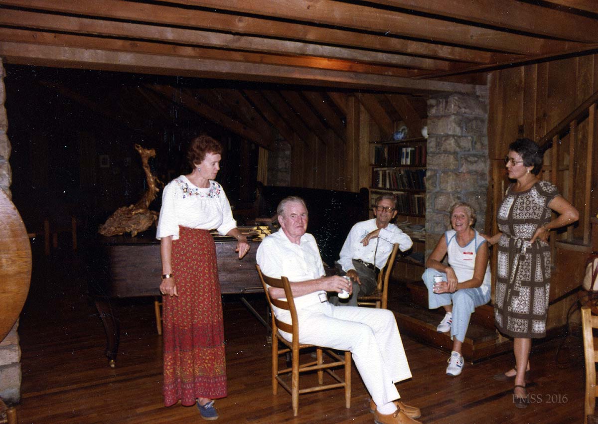 [schuler_mem_020c.jpg] 5 unidentified people and Ruth, gathered near piano in Laurel House.
