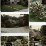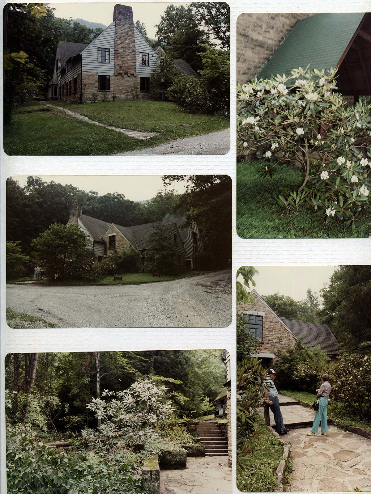 [schuler_mem_021.jpg] Page with 5 color photographs, clockwise: Laurel House, front view; rhododendron at Chapel entrance; Ruth and unidentified man on stone walk in front of Laurel House; rhododendron at stone wall and steps, side of Laurel House; full view of Laurel House from road. Each photograph is displayed separately and enlarged: