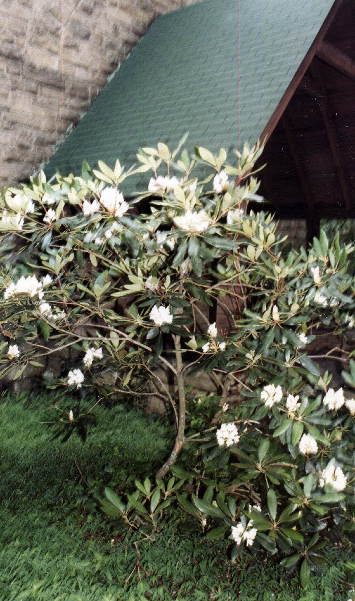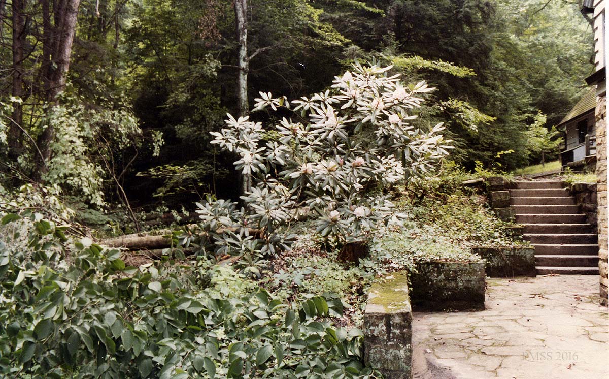 [schuler_mem_021c.jpg] Rhododendron at stone wall and steps, side of Laurel House.
