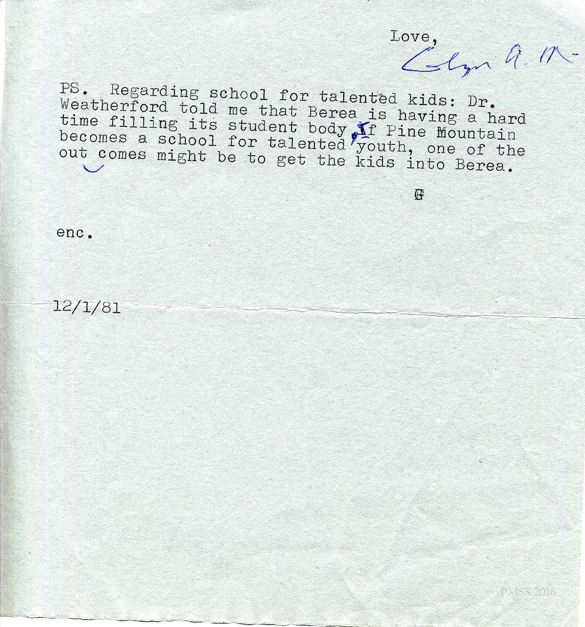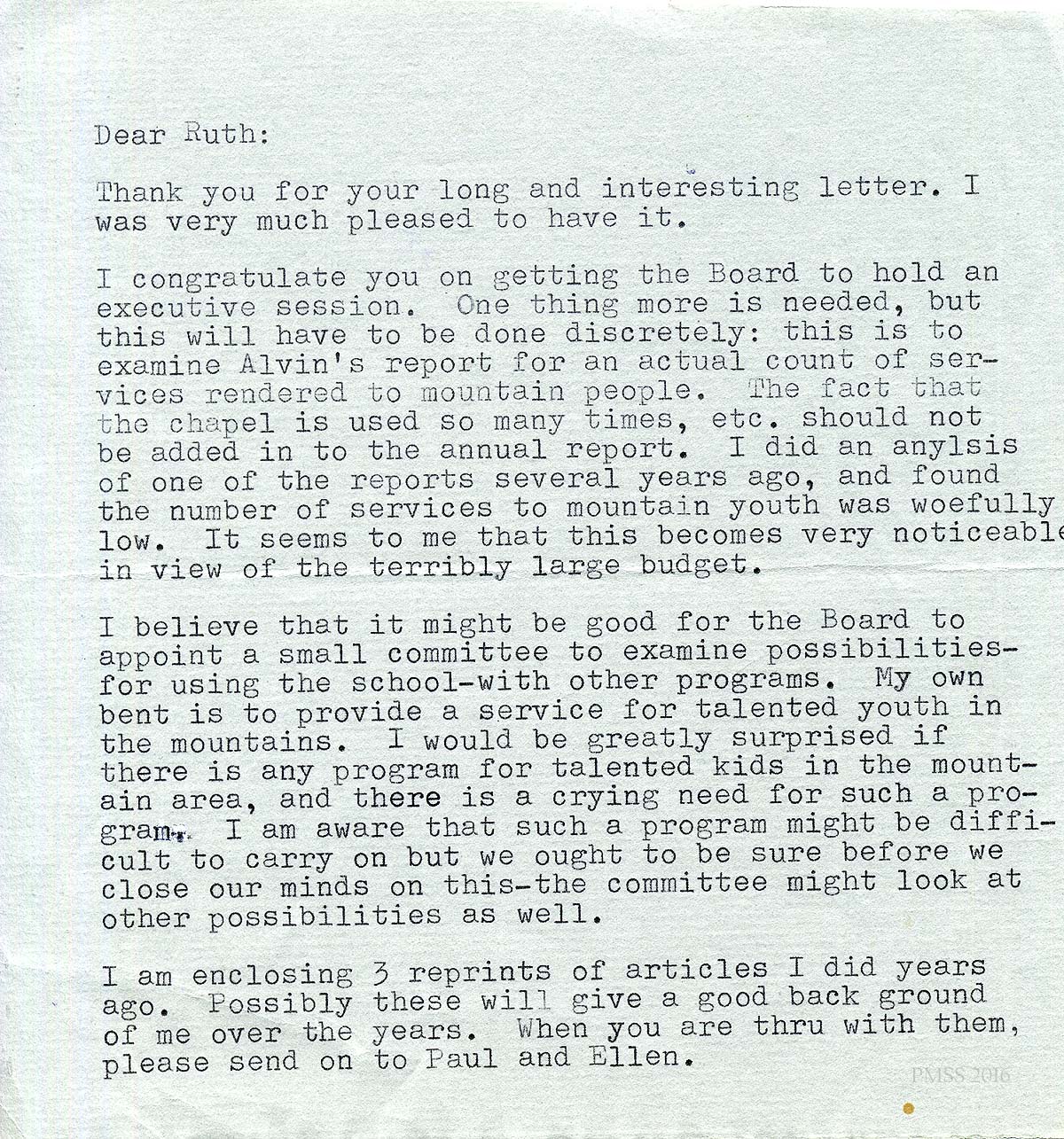 [schuler_mem_023.jpg] and [schuler_mem_023a.jpg] Typed 2-page letter from Glyn Morris, dated 12/1/81. Thanks Ruth for her letter and congratulates her for “getting the Board to hold an executive session.” States concern that “the number of services to mountain youth [has been] woefully low” and suggests a Board committee to address this. Feels that PMSS needs to provide programs for talented mountain youth, which may help Berea fill its student body. Encloses 3 reprints of his articles as updates on his activities.