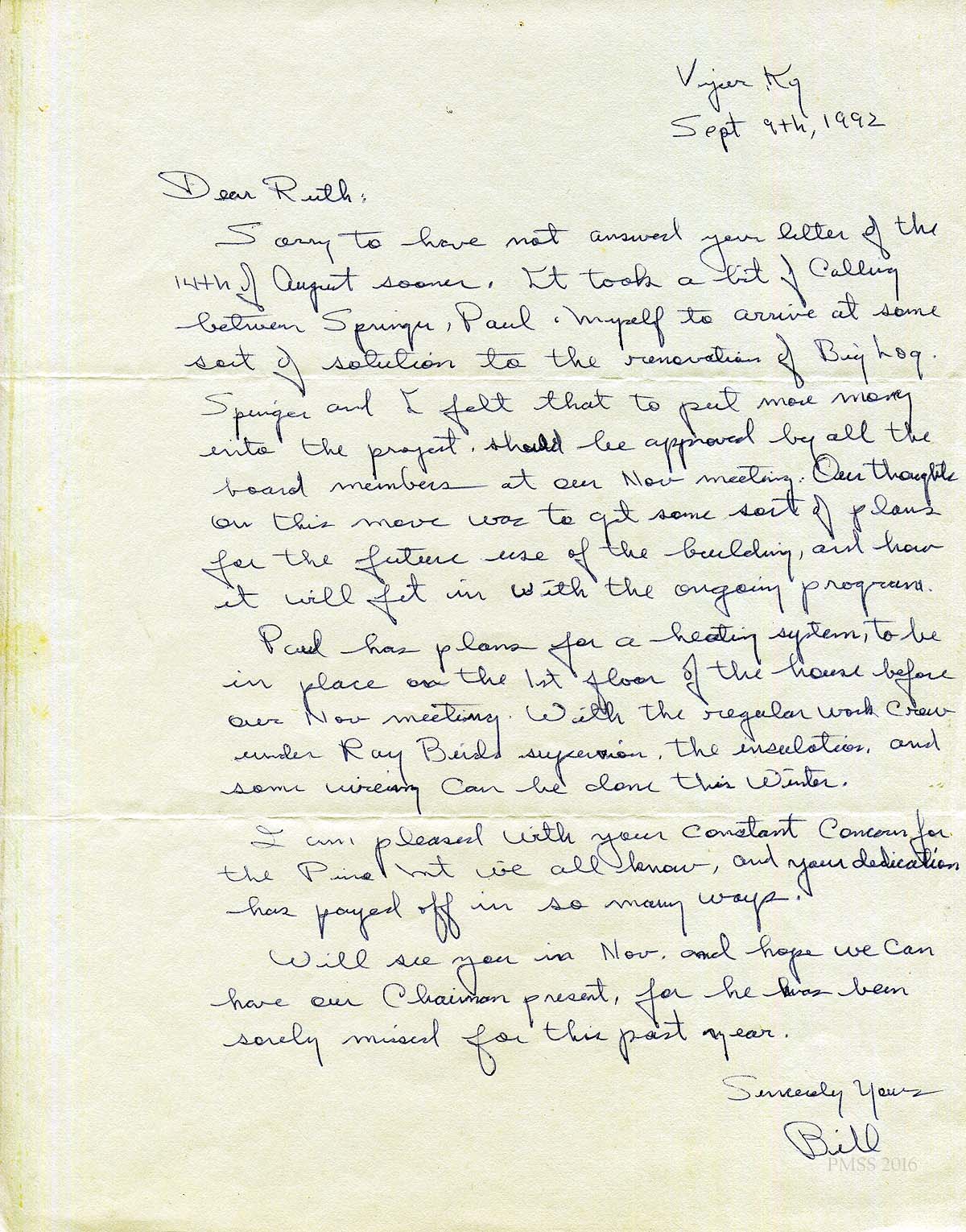 [schuler_mem_024.jpg] Handwritten letter from Bill [Hayes], Viper, KY, Sept. 9th, 1992. Answers Ruth’s letter about renovating Big Log after consulting with Springer Hoskins and Paul Hayes. The Board needs to add more funds to the project and plan for its future use. Paul plans to install a heating system on the first floor; insulation, and some wiring, with Ray Bird’s supervision.