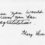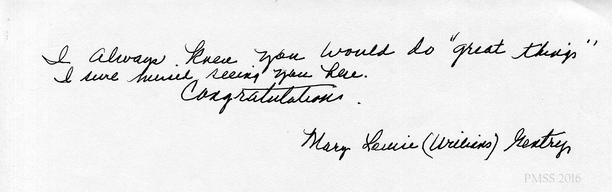[schuler_mem_027.jpg] Handwritten note of congratulations from Mary Lewis(?) (Williams) Gentry.
