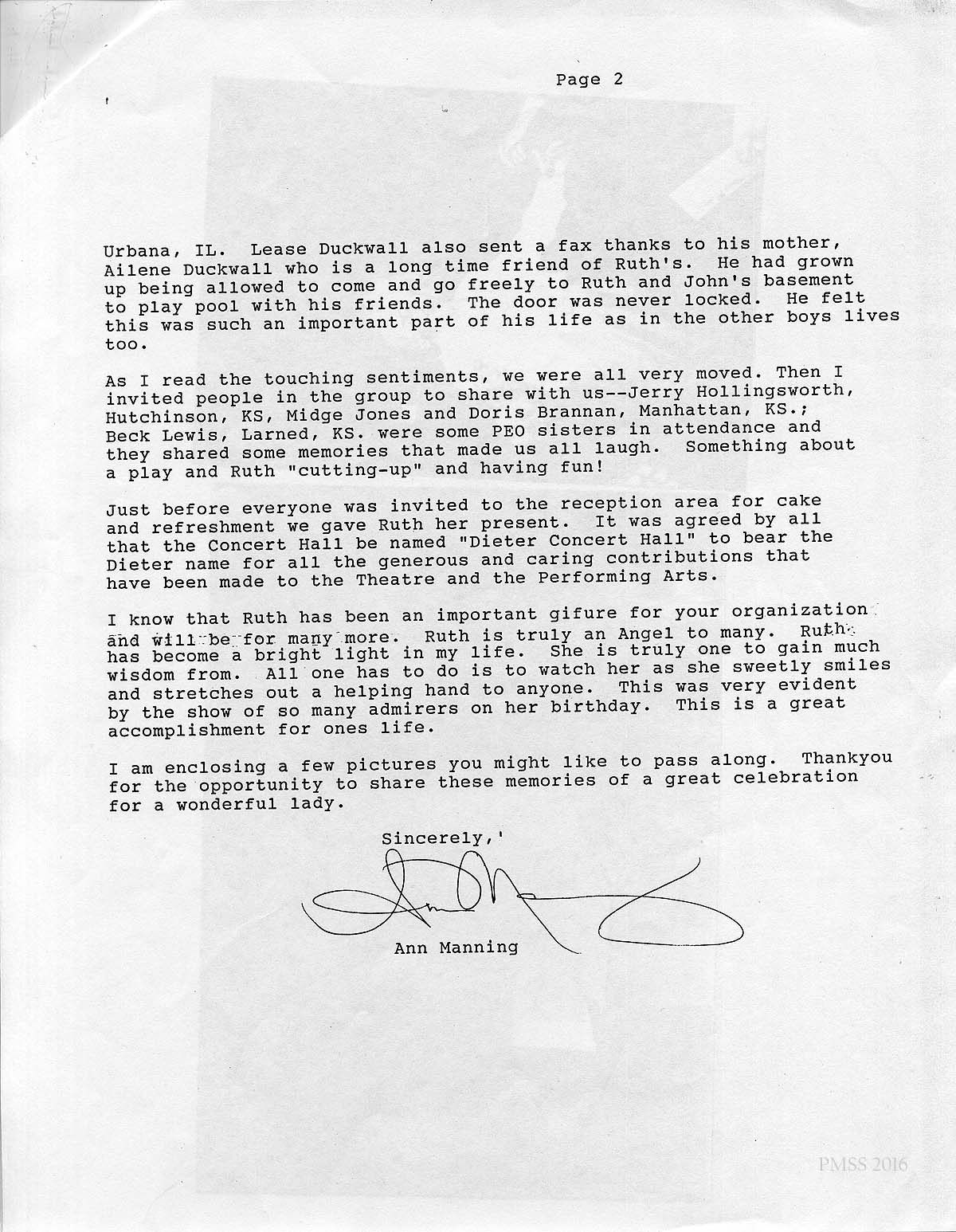 [schuler_mem_029.jpg] and [schuler_mem_029a.jpg] Typed letter with header: “Ann Manning,…Abilene, Kansas” to Marge Lederer, Abilene, KS. Sends description of Ruth’s 75th birthday party: 100 admirers attended Ruth’s surprise celebration at the Great Plains Theatre Festival Concert Hall in the Tietjen Center for the Performing Arts Building in Abilene, KS. Brother Ed Shuler in Greensboro NC and sister Bessie Finch in Fulton, TN, sent wishes. PMSS Alumni sent flowers and faxes from their homecoming and board meeting at PMSS, the first Ruth missed in 17 years. Also Ruth heard from Jane Hobgood, Ruth’s Berea roommate; longtime friends and PEO sisters. Sends photographs: