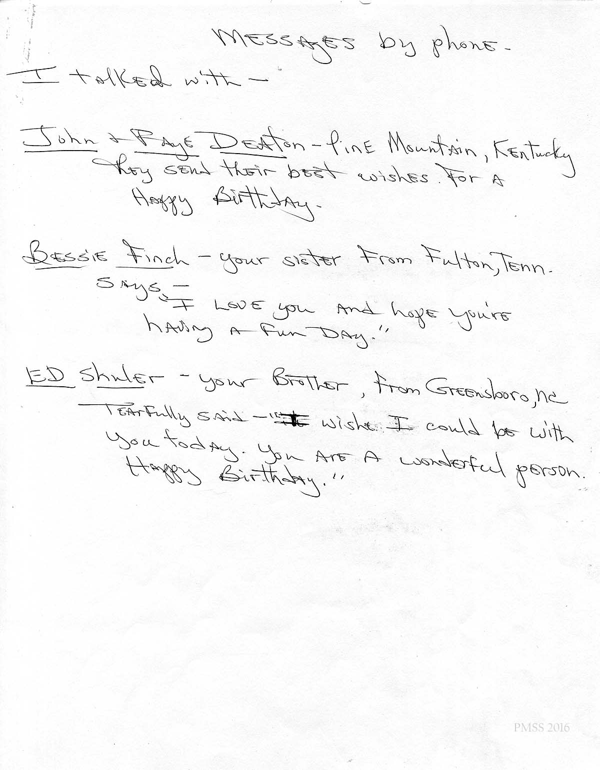 Page 64. Handwritten unsigned note, listing three phone messages of good wishes to Ruth from John and Faye Deaton, Pine Mt., KY; Bessie Finch, Ruth’s sister from Fulton, TN; and Ed Shuler, Ruth’s brother from Greensboro, NC.
