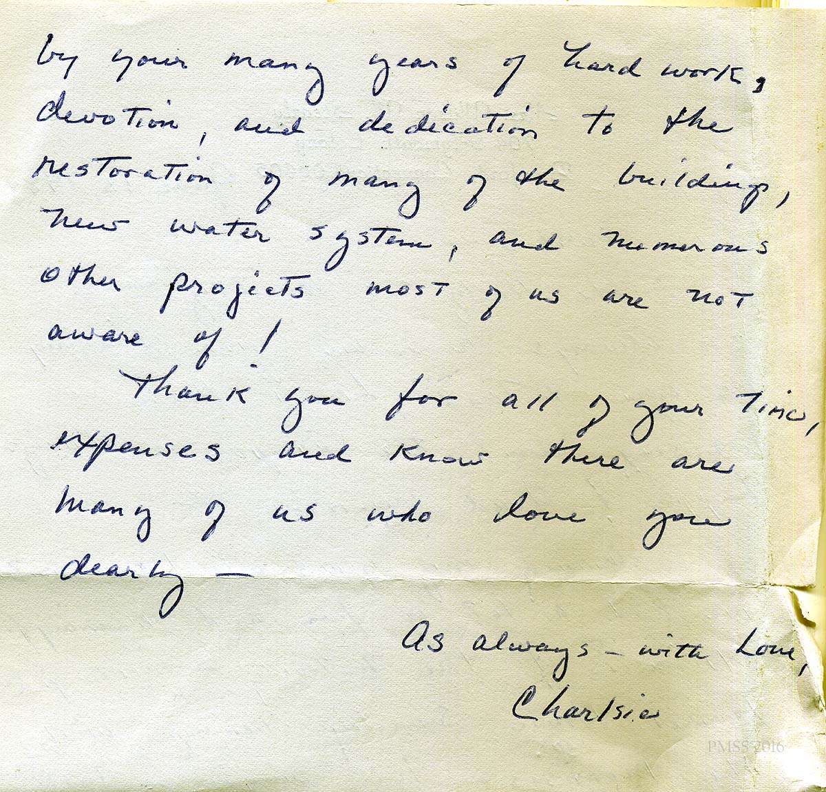 …I was deeply touched by your statement honoring the occasion of last weekend! Actually the most meaningful gift anyone can receive is a recognition that through the years he has contributed something to a worthy cause. Such contribution on my part was never considered a sacrifice but a span of 18 years when I grew because of the contacts with a worthy group of boys and girls and the close association with a group of Christian “workers….”
