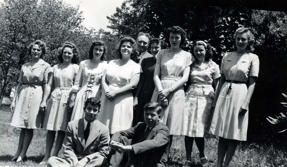 Page 46. Black/white photograph of eight young women in long gowns, standing at edge of pool that is reflecting their images.