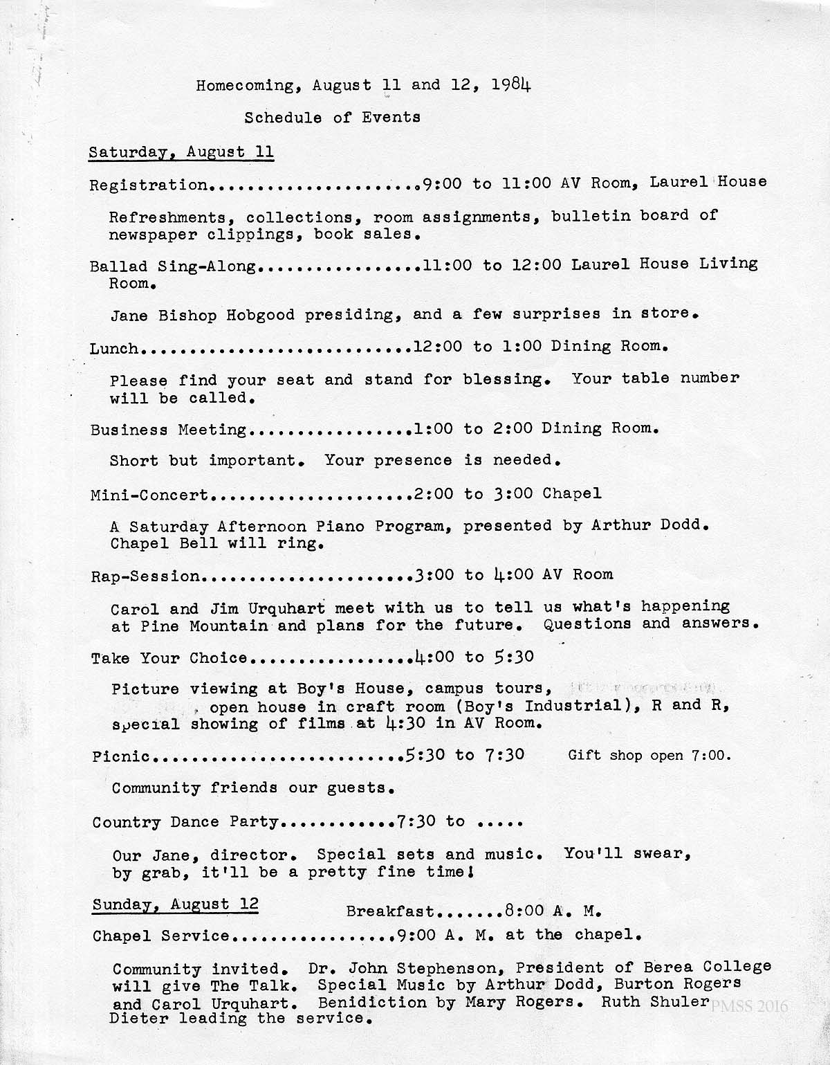 Page 51. Typed Schedule of Events for Homecoming, August 11 and 12, 1984. Included ballad sing-along and business meeting in Laurel House, mini-concert in Chapel by Arthur Dodd, rap-session with Carol and Jim Urquhart, picture viewing at Boy’s House, campus tours, open house in craft room (Boy’s Industrial Building), special showing of films and a country dance party. Chapel service on Sunday featured talk by Dr. John Stephenson (President of Berea College), special music by Arthur Dodd, Burton Rogers and Carol Urquhart, Benediction by Mary Rogers, and Ruth Shuler Dieter leading the service.