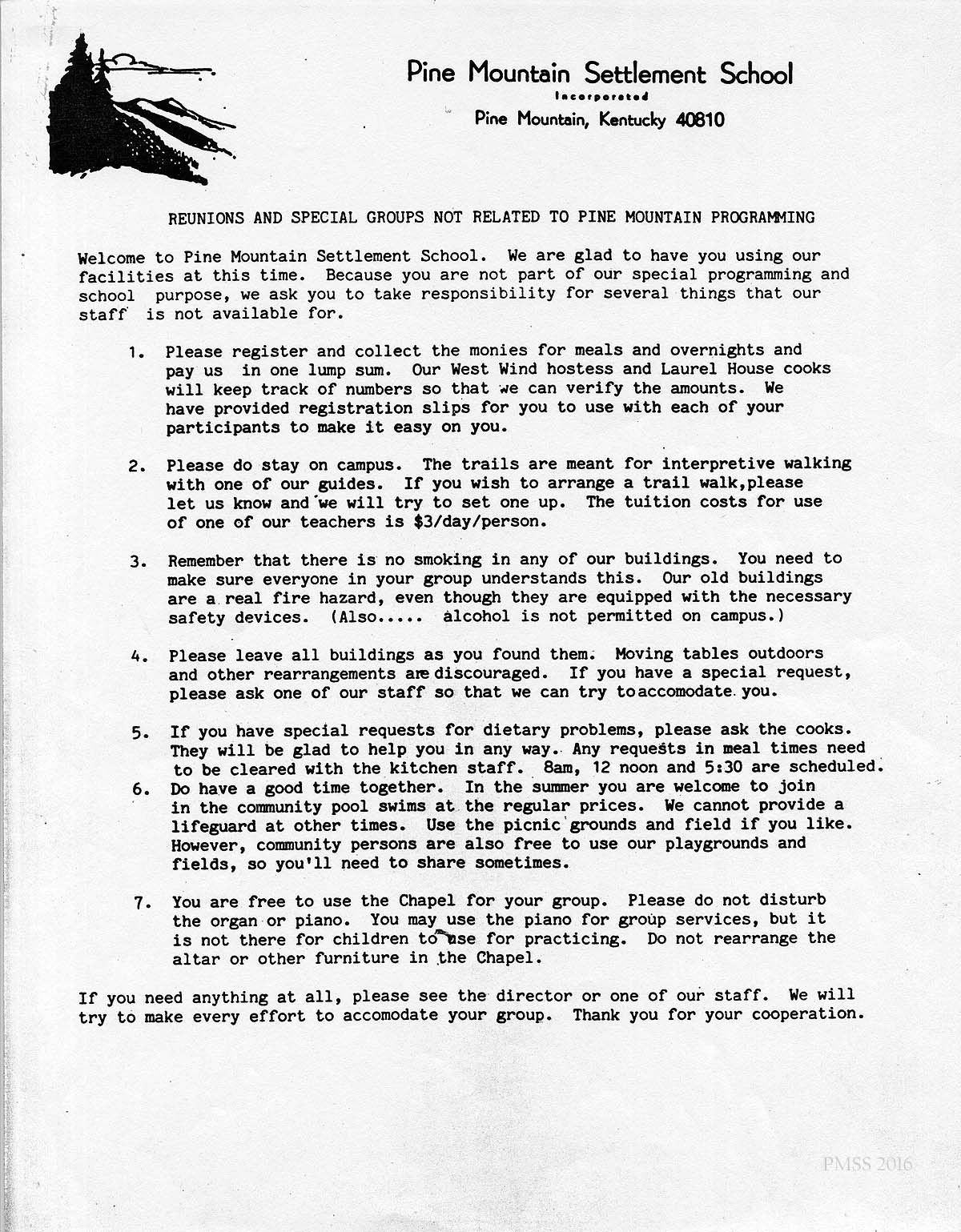 Title: “REUNIONS AND SPECIAL GROUPS NOT RELATED TO PINE MOUNTAIN PROGRAMMING” – A list of rules and policies for visiting groups: how to register and pay fees, instructions for using trails, avoiding smoking or alcohol, leaving furniture in place, requesting special diets, swimming, using picnic grounds and field, and using Chapel and piano.